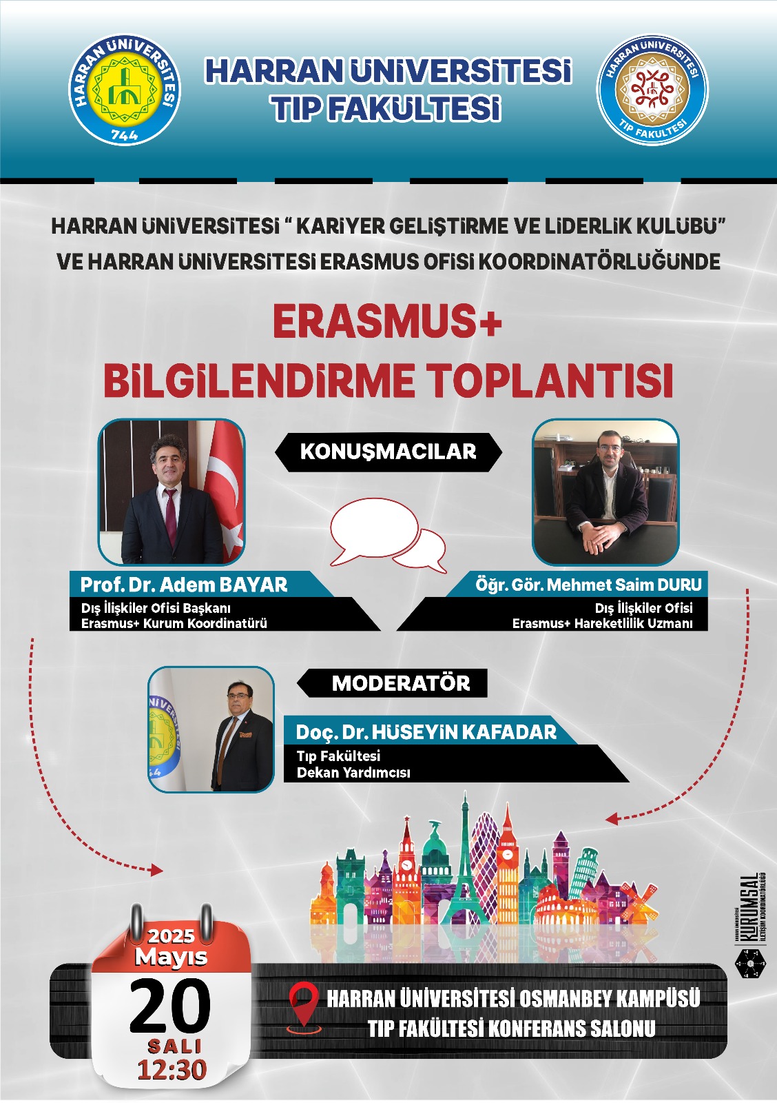 Fakültemiz Kariyer Geliştirme ve Liderlik Kulübü ve Harran Üniversitesi ERASMUS Ofisi Koordinatörlüğünde 20.05.2025 tarihinde saat 12.30-13.30 saatleri arasında Prof. Dr. Adem BAYAR y-tarafından "Erasmus Bilgilendirme Konferansı" yapılacaktır.