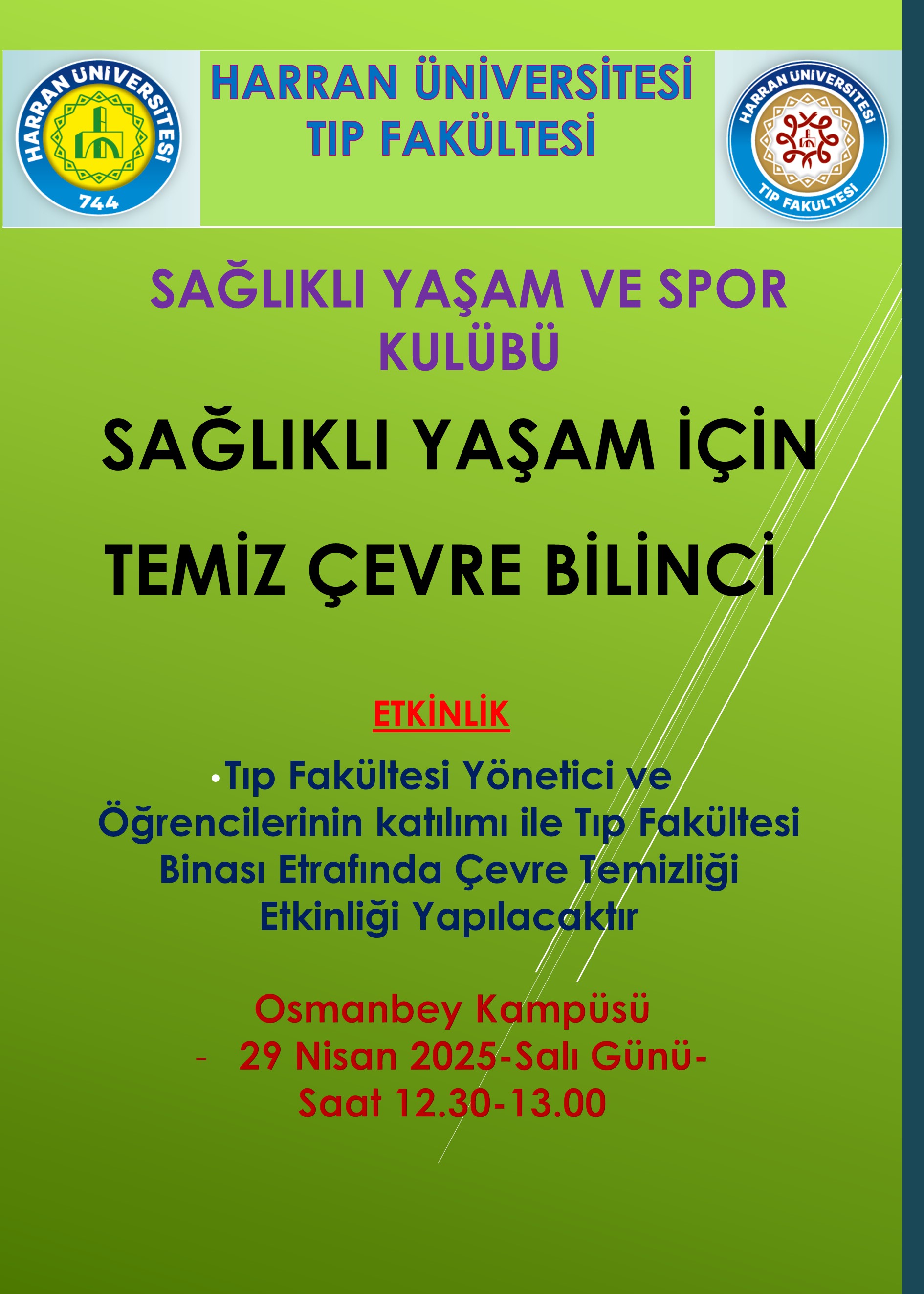 Fakültemiz Sağlıklı Yaşam ve Spor Kulübü tarafından "Sağlıklı Yaşam için Temiz Çevre Bilinci" etkinliği yapılacaktır (29.04.2025).
