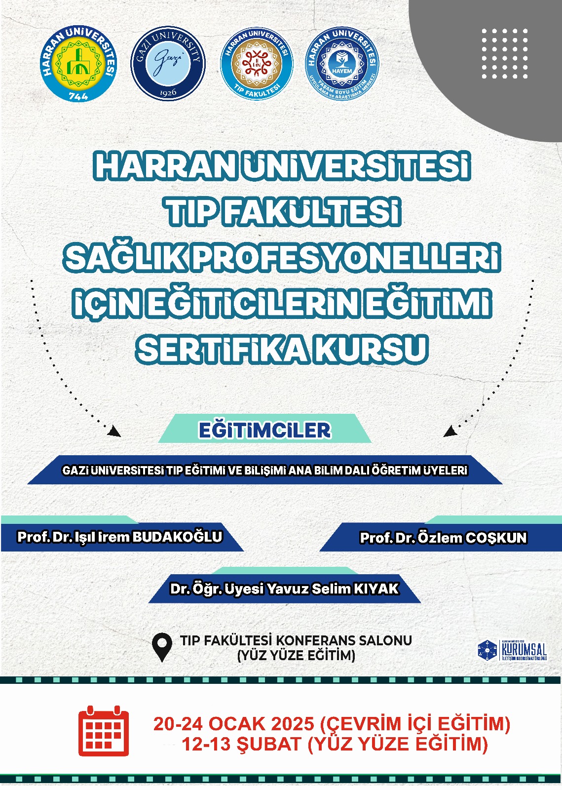 Harran Üniversitesi Tıp Fakültesi Dekanlığı Koordinatörlüğünde, Gazi Üniversitesi ve Harran Üniversitesi Yaşam Boyu Eğitim Uygulama ve Araştırma Merkezi (HAYEM) iş birliği ile; öğretim elemanlarının eğitici niteliklerinin geliştirilmesi, etkin, güncel eğitim ve ölçme değerlendirme yöntemlerinin kullanılmasını sağlamak amacıyla “SAĞLIK PROFESYONELLERİ İÇİN EĞİTİCİ EĞİTİMİ SERTİFİKASI KURSU” ve “SAĞLIK PROFESYONELLERİ İÇİN PROBLEME DAYALI ÖĞRENME (PDÖ) KURSU” düzenlenecektir. Her iki kurs programına ait bilgiler paylaşılmıştır.