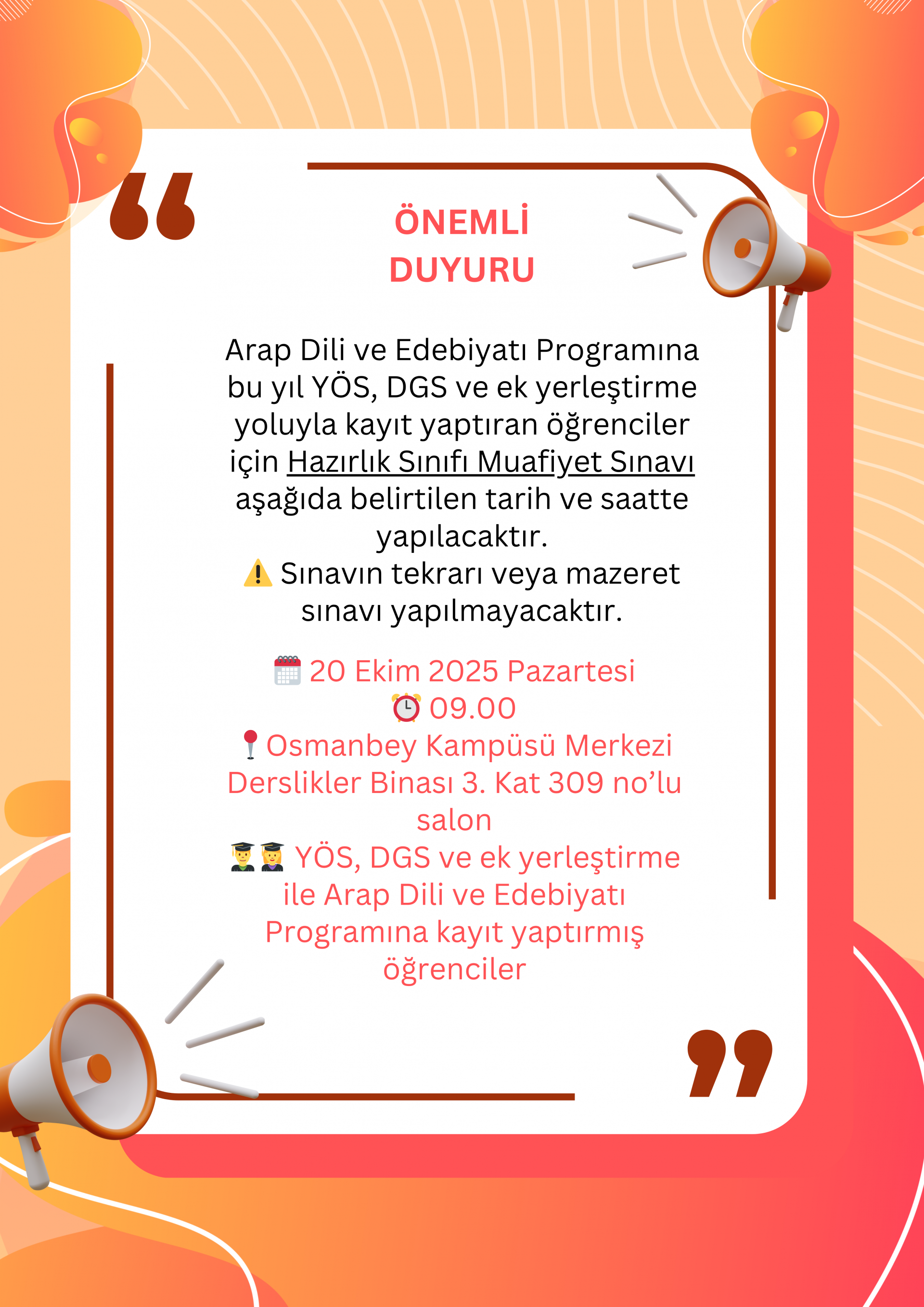 Arap Dili ve Edebiyatı Programına bu yıl YÖS, DGS ve ek yerleştirme yoluyla kayıt yaptıran öğrenciler için Hazırlık Sınıfı Muafiyet Sınavı aşağıda belirtilen tarih ve saatte yapılacaktır.