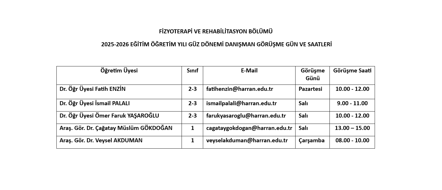 2025-2026 Eğitim Öğretim Yılı Güz Dönemi Akademik Danışman Gün ve Saatleri