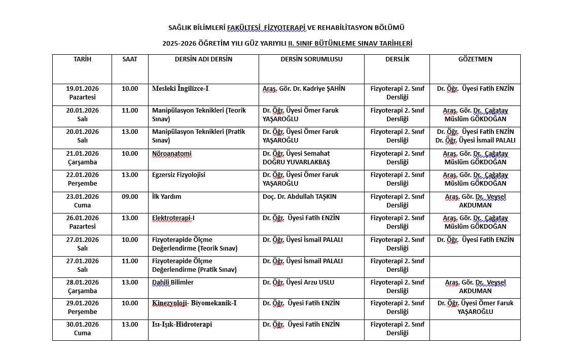 FİZYOTERAPİ VE REHABİLİTASYON 2025-2026 GÜZ BÜTÜNLEME SINAV TAKVİMİ (Güncellenmiş)