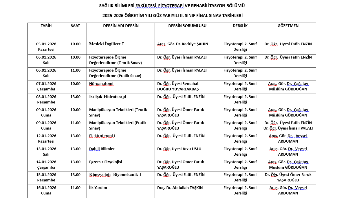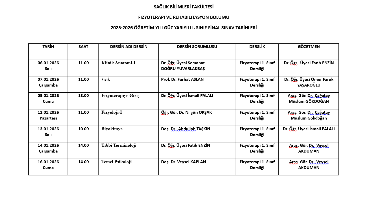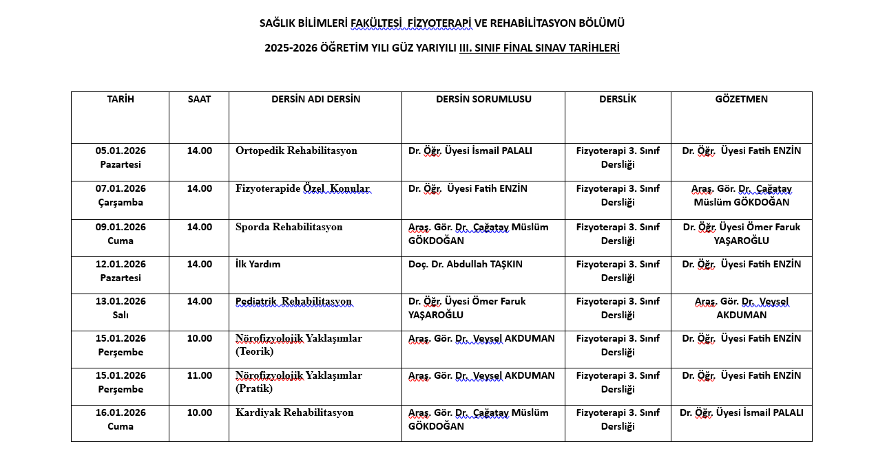 FİZYOTERAPİ VE REHABİLİTASYON 2025-2026 GÜZ FİNAL SINAV TAKVİMİ (Güncellenmiş)