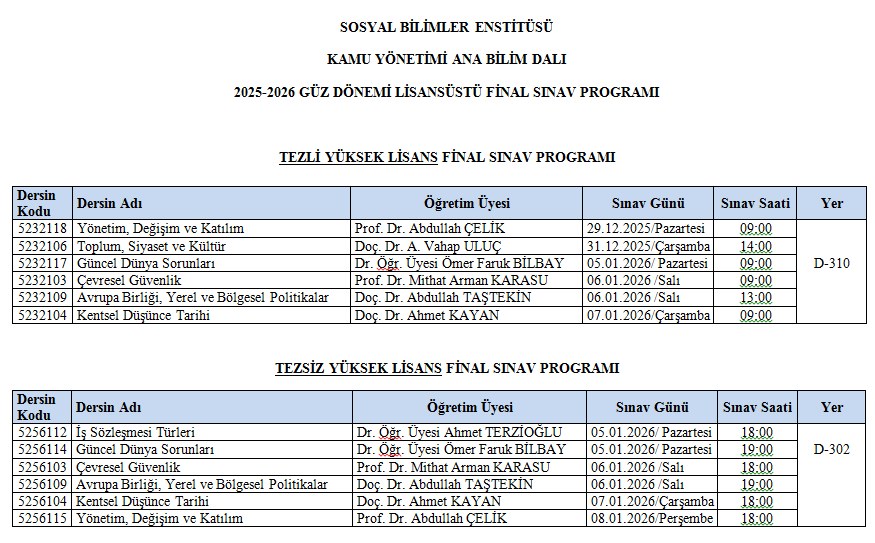 2025-2026 GÜZ DÖNEMİ LİSANSÜSTÜ FİNAL SINAV PROGRAMI
