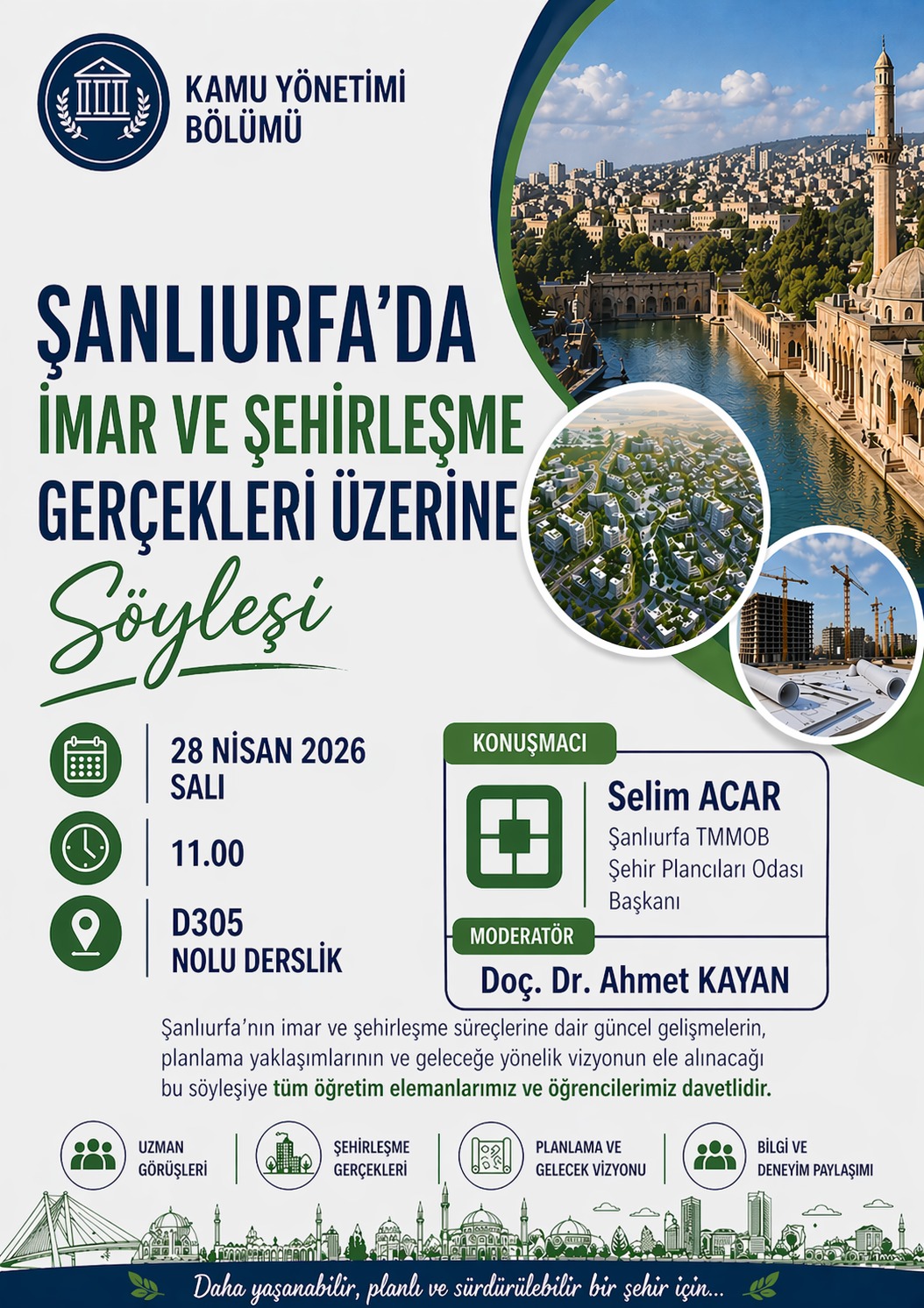 Bu kapsamda, Şanlıurfa TMMOB Şehir Plancıları Odası Başkanı Selim ACAR, bölümümüz öğretim elemanları ve öğrencileriyle bir araya gelerek uzman görüşlerini ve deneyimlerini paylaşacaktır.