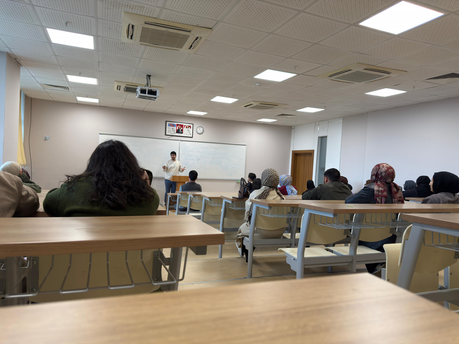 Toplantıya Kamu Yönetimi Bölümü öğrencileri katılım sağlamış; etkinlik kapsamında Erasmus başvuru koşulları, başvuru takvimi, başvuru yöntemi, anlaşmalı üniversiteler ve başvuru sonrası süreçlere ilişkin detaylı bilgiler paylaşılmıştır.