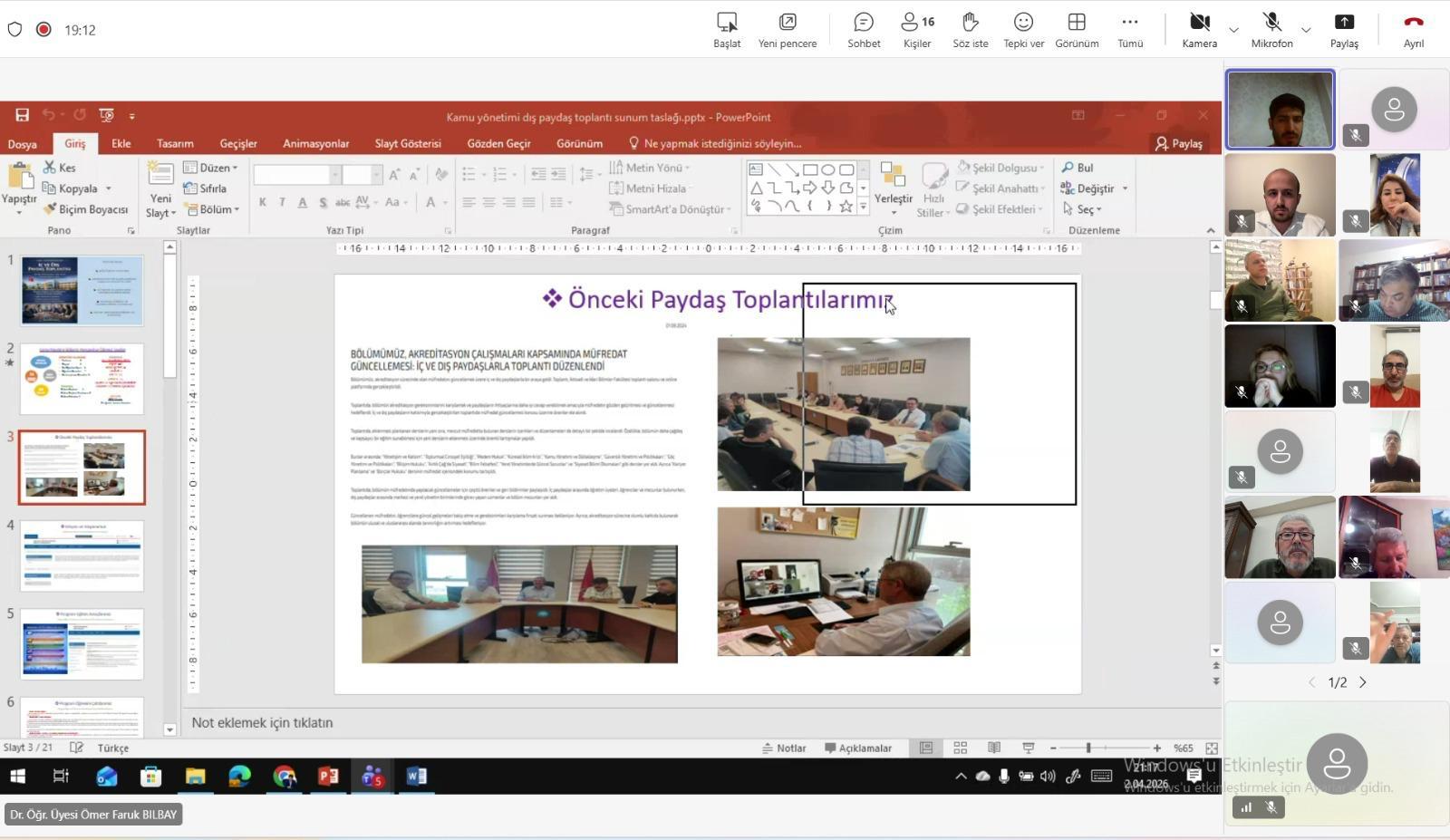 Kamu Yönetimi Bölümü olarak, akreditasyon sürecine ilişkin değerlendirmelerde bulunmak üzere 02 Nisan akşamı saat 21.00’de danışma kurulu üyelerimizle çevrimiçi bir toplantı gerçekleştirdik. Toplantıda, akreditasyon sürecine ilişkin görüş ve öneriler paylaşıldı; üyelerimizin katkılarıyla bölümümüzün yürüttüğü çalışmalara değerli geri bildirimler alındı.