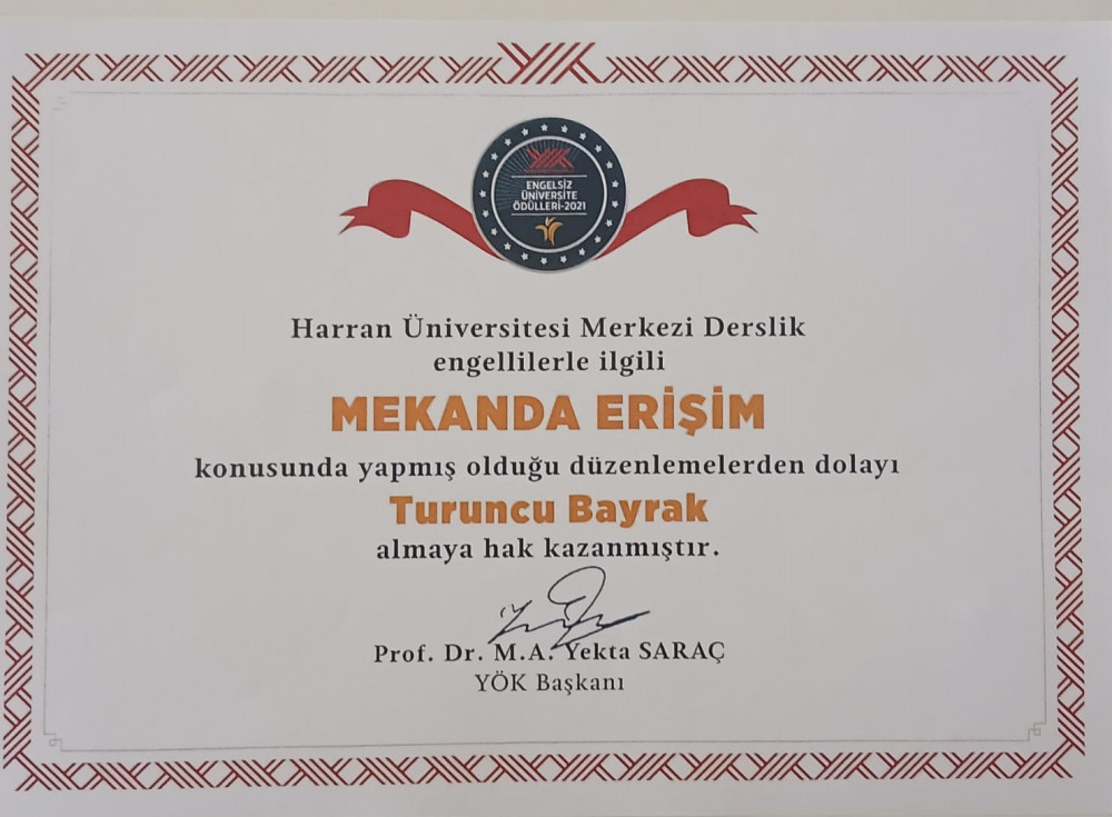 Harran Üniversitesi, Yükseköğretim Kurulu tarafından verilen Mekânda Erişilebilirlik (Turuncu Bayrak) kapsamında toplam 16 bayrak ödülüne sahiptir. Bu durum, üniversitenin erişilebilirlik standartlarını sağlama ve geliştirme konusundaki kararlılığını göstermektedir.