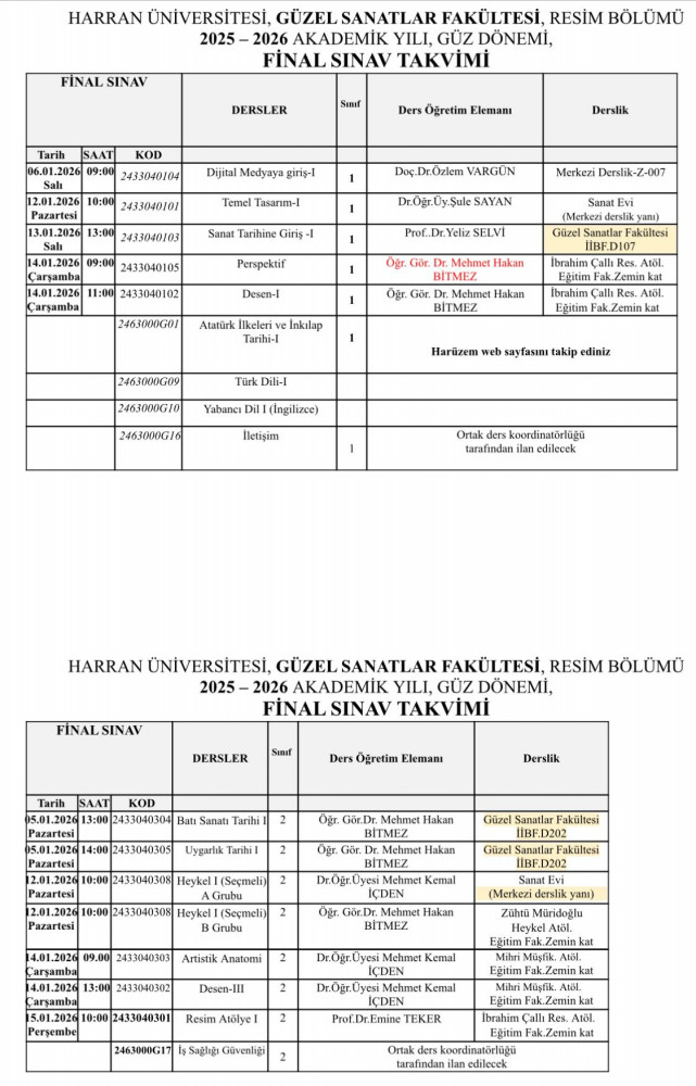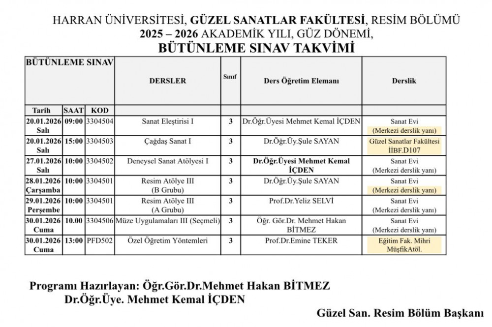 Güncellenmiş Bütünleme Sınav Takvimi