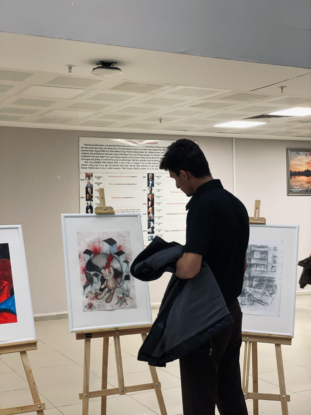 Resim Bölümü I. sınıf öğrencilerimiz Harran Üniversitesi Rektörlüğü tarafından düzenlenen Akademik Başarı ve Ödül Töreni’nde küratörlüğünü Dr. Öğr. Üy. M. Kemal İçden’in yaptığı “Ortaya Karışık” temalı bir sergi açtılar.Sanatın farklı disiplinlerini bir araya getiren bu tema kapsamında Resim Bölümü I. sınıf öğrencilerimiz izledikleri filmler, okudukları kitaplar, dinledikleri müzikler eşliğinde kendilerini hikâyenin dünyasına bıraktılar ve eserlerin atmosferini, karakterlerin duygularını ve anlatılan hikâyeyi kendi bakış açılarıyla içselleştirerek, zihinsel bir yolculuğa çıktılar. Sonrasında ise, izlenimleri ve hayal dünyalarıyla yoğurdukları bu anlatıları, çizimlerine aktararak, sahneleri soyut ve somut formlarla yeniden yorumladılar. Bu süreç, sanatın sadece görsellikle değil, duygu ve düşüncelerle de şekillendiğini gösteren kısmmen interaktif bir deneyime dönüştü. Her çizim, sanatçısının iç dünyasından izler taşıyan, o eserlerden ilham alarak yeniden doğmuş özgün bir anlatı haline geldi. Sanat, bireysel deneyimlerin bir toplamıdır ve öğrencilerimiz de bu süreci yaşayarak kendi yorumlarını ortaya koymuştur. Her resim, bir hikâyenin yeniden doğuşu; her fırça darbesi, ruhlarından gelen bir iz olmuştur.