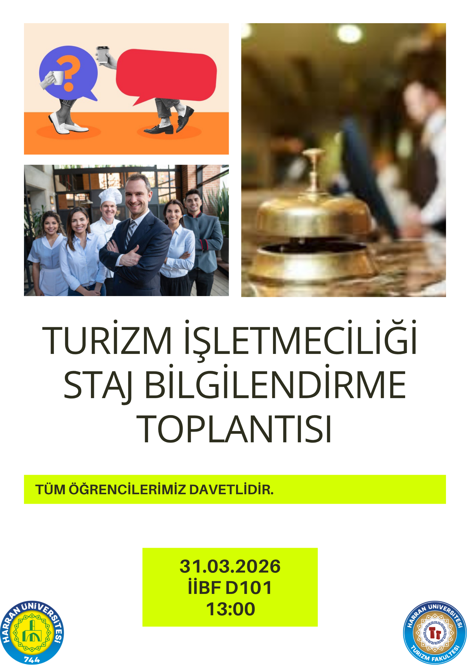 Turizm işletmeciliği bölümü öğrencileri içi staj bilgilendirme toplantısı yapılacaktır. Tüm öğrencilerimiz davetlidir.