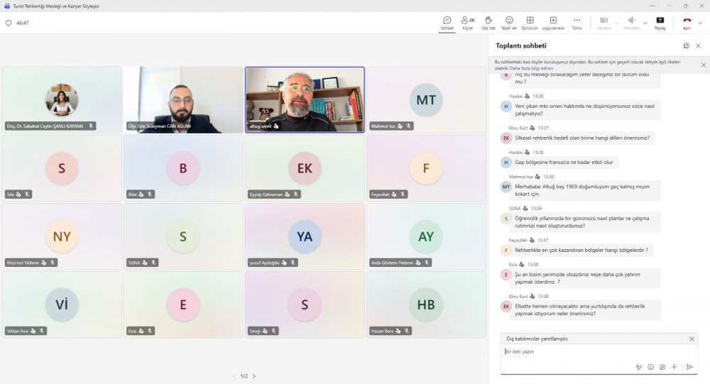 Yüksekokulumuz Seyahat, Turizm ve Eğlence Hizmetleri Bölümü Turist Rehberliği Programı tarafından düzenlenen “Turist Rehberliği Mesleği ve Kariyer” konulu söyleşi, 24 Şubat 2026 tarihinde çevrim içi ortamda, Öğr. Gör. Süleyman Can ASLAN moderatörlüğünde ve bölüm öğretim elemanlarının katılımıyla gerçekleştirildi.