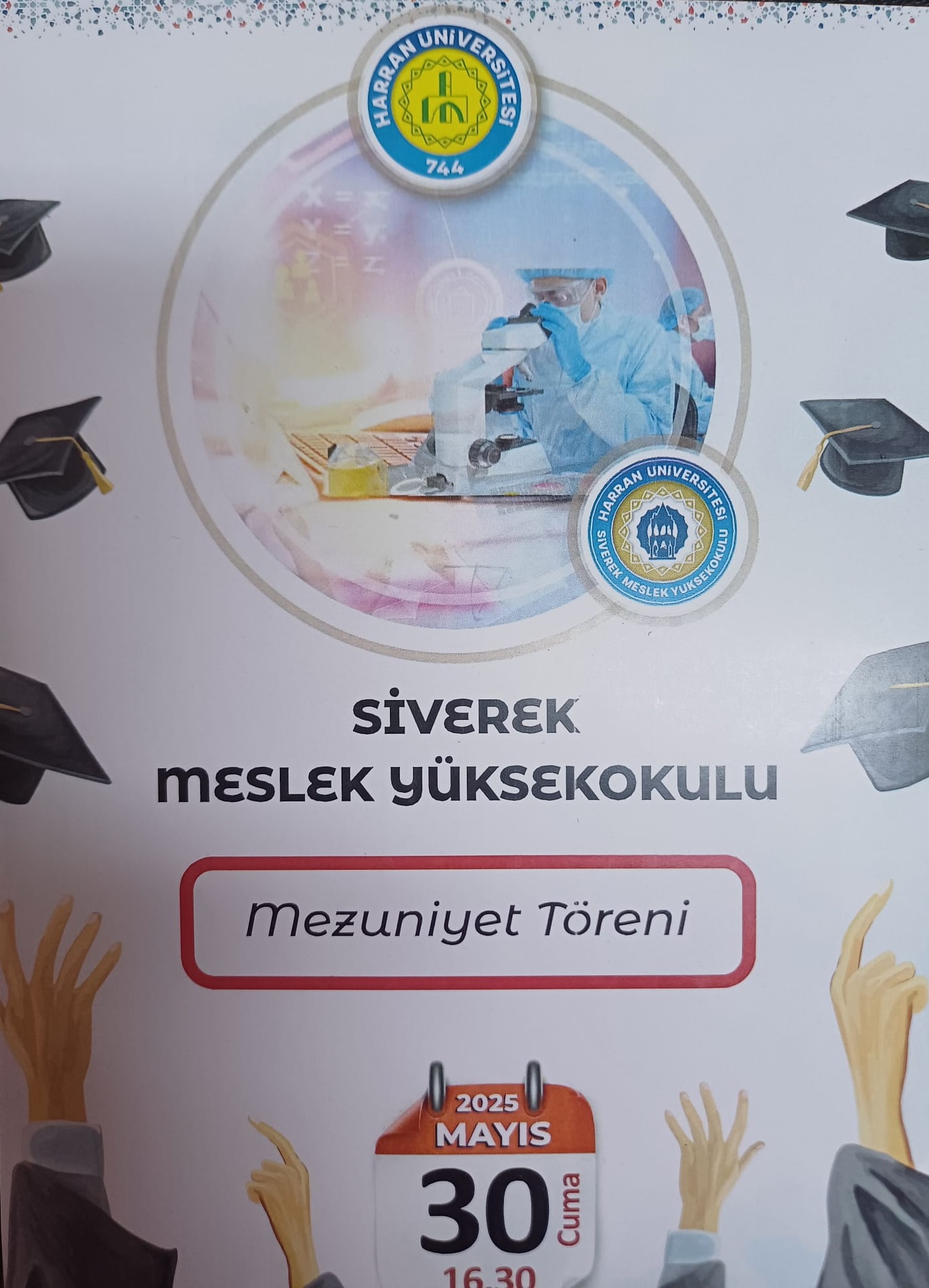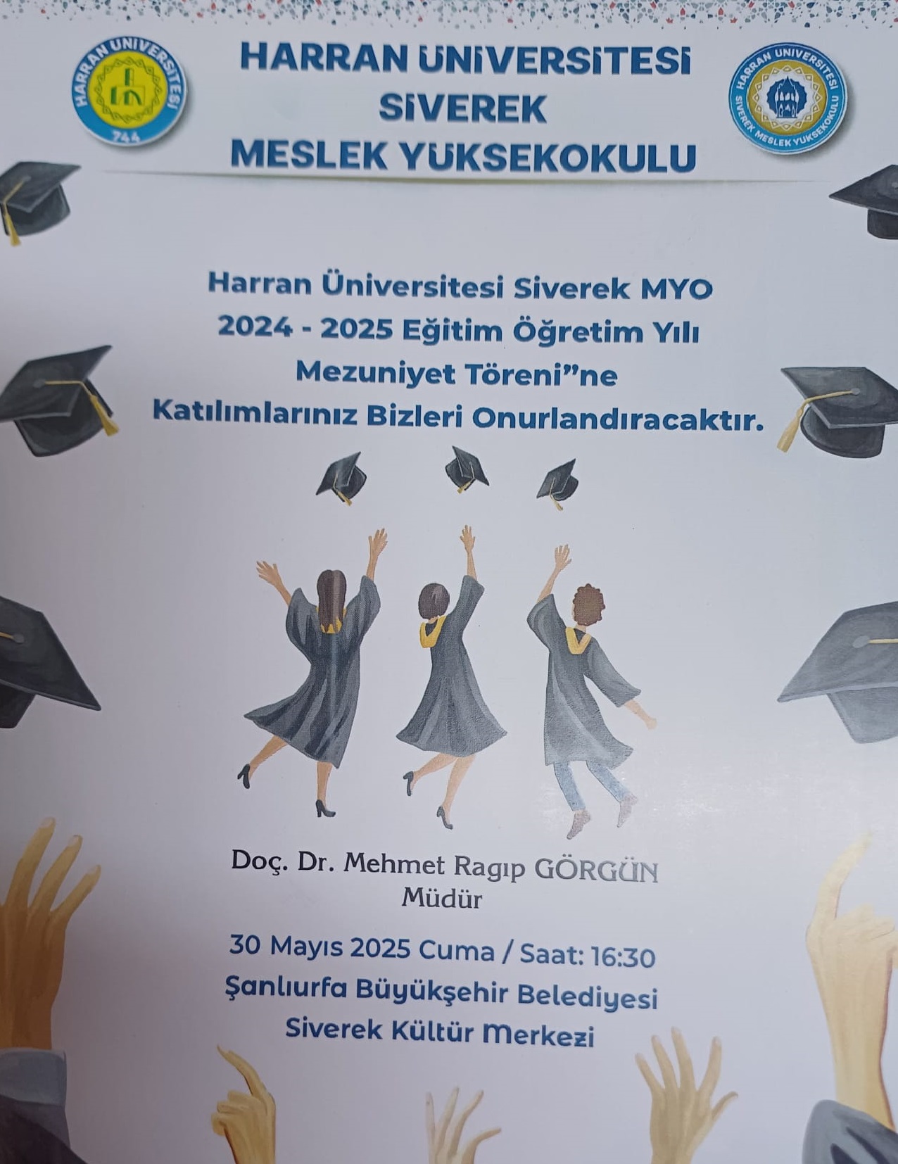 Meslek Yüksekokulumuz 2024-2025 Eğitim Öğretim Yılı Mezuniyet Törenimiz 30.05.2025 tarihinde saat 16.30 da Şanlıurfa Büyükşehir Belediyesi Siverek Kültür Merkezinde  yapılacaktır.