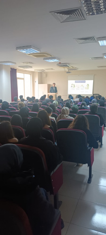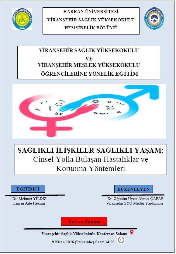 Viranşehir Sağlık Yüksekokulu ve Viranşehir Meslek Yüksekokulu iş birliğiyle düzenlenen “Sağlıklı İlişkiler, Sağlıklı Yaşam: Cinsel Yolla Bulaşan Hastalıklar ve Korunma Yöntemleri” başlıklı eğitim programı, 9 Nisan 2026 tarihinde Viranşehir Kampüsü Konferans Salonu’nda öğrencilerin yoğun katılımıyla gerçekleştirildi. Programda cinsel yolla bulaşan hastalıklar, korunma yöntemleri ve sağlıklı ilişkilerin önemi ele alınırken, gençlerin doğru bilgiye erişiminin ve toplumsal sağlık bilincinin artırılmasının gerekliliği vurgulandı. Etkinlik, katılımcıların memnuniyetiyle tamamlandı. Yüksekokul Müdürümiz Öğr. Gör. Mustafa ŞAHİN, etkinliğe katkı sunan tüm paydaşlara ve katılım sağlayan öğrencilere teşekkür ederek benzer faaliyetlerin sürdürüleceğini ifade etti.