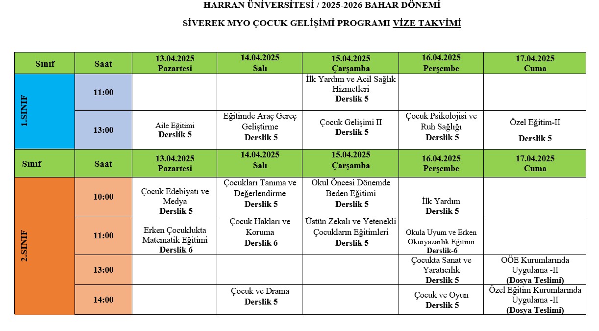2025/2026 BAHAR DÖNEMİ VİZE TAKVİMİ