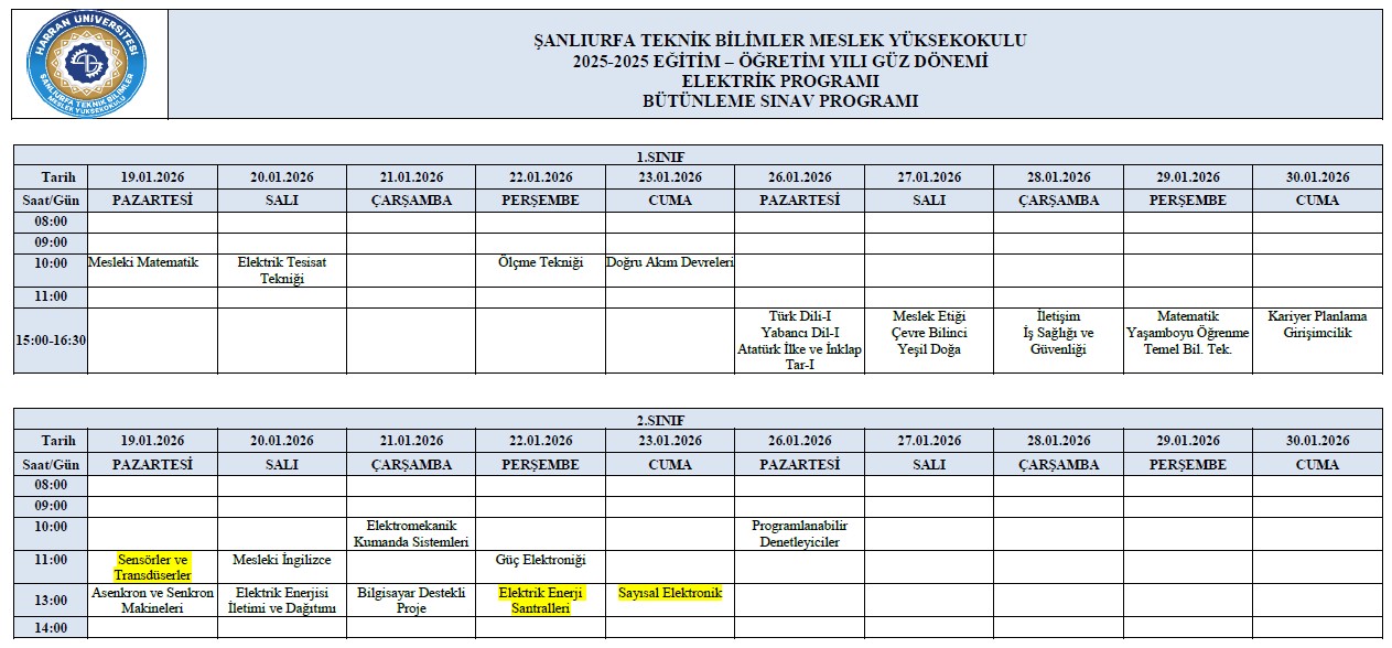 2025 Güz Dönemi Elektrik Programı Bütünleme Sınav Programı