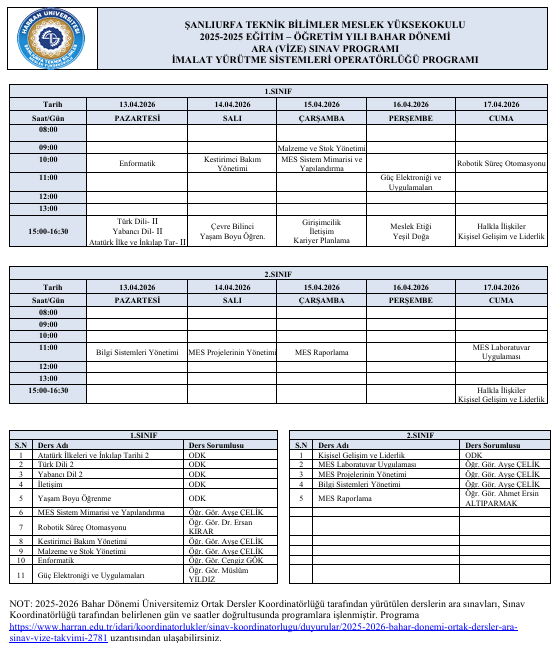 2025-2026 Bahar Dönemi Ara Sınav Programı