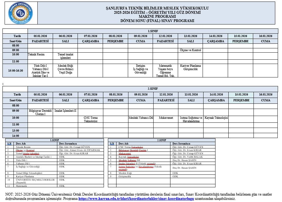 DÖNEM SONU (FİNAL) SINAV PROGRAMI (GÜNCEL)