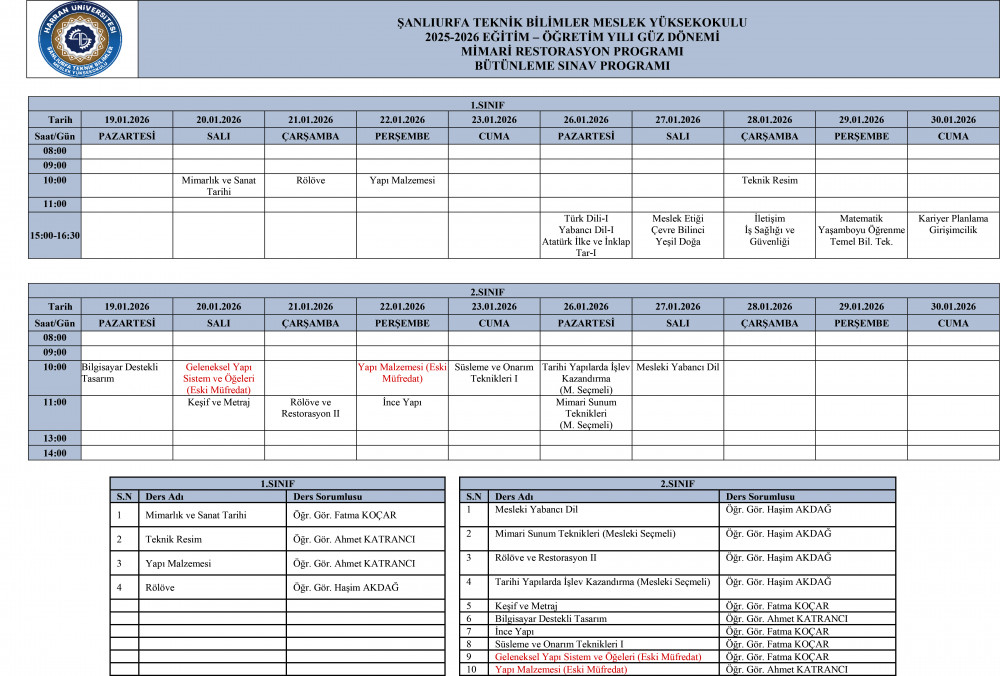 NOT: 2025-2026 Güz Dönemi Üniversitemiz Ortak Dersler Koordinatörlüğü tarafından yürütülen derslerin Bütünleme sınavları, Sınav Koordinatörlüğü tarafından belirlenen gün ve saatler doğrultusunda programlara işlenmiştir. Programa https://www.harran.edu.tr/idari/koordinatorlukler/sinav-koordinatorlugu uzantısından ulaşabilirsiniz.