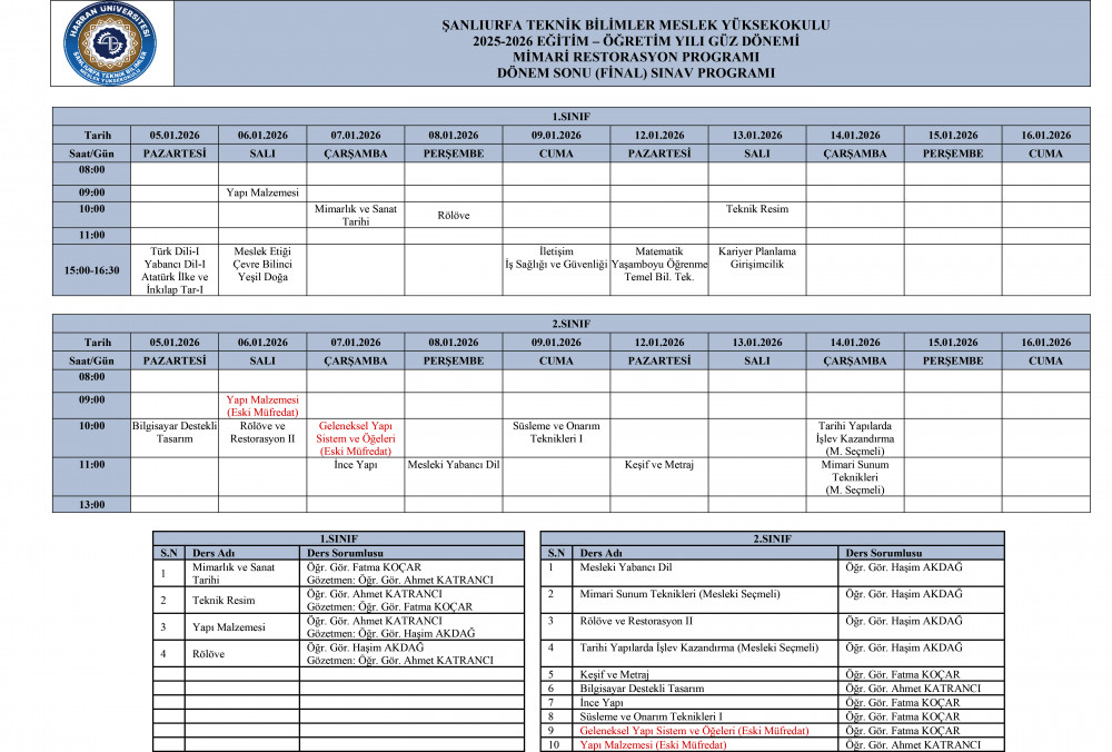 NOT: 2025-2026 Güz Dönemi Üniversitemiz Ortak Dersler Koordinatörlüğü tarafından yürütülen derslerin Dönem Sonu (Final) sınavları, Sınav Koordinatörlüğü tarafından belirlenen gün ve saatler doğrultusunda programlara işlenmiştir. Programa https://www.harran.edu.tr/idari/koordinatorlukler/sinav-koordinatorlugu uzantısından ulaşabilirsiniz.
