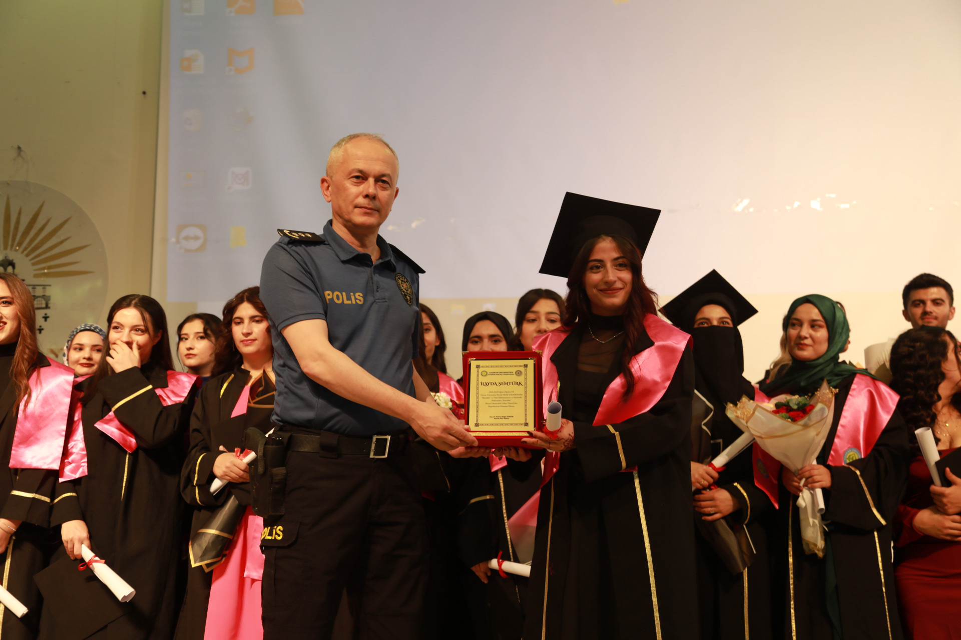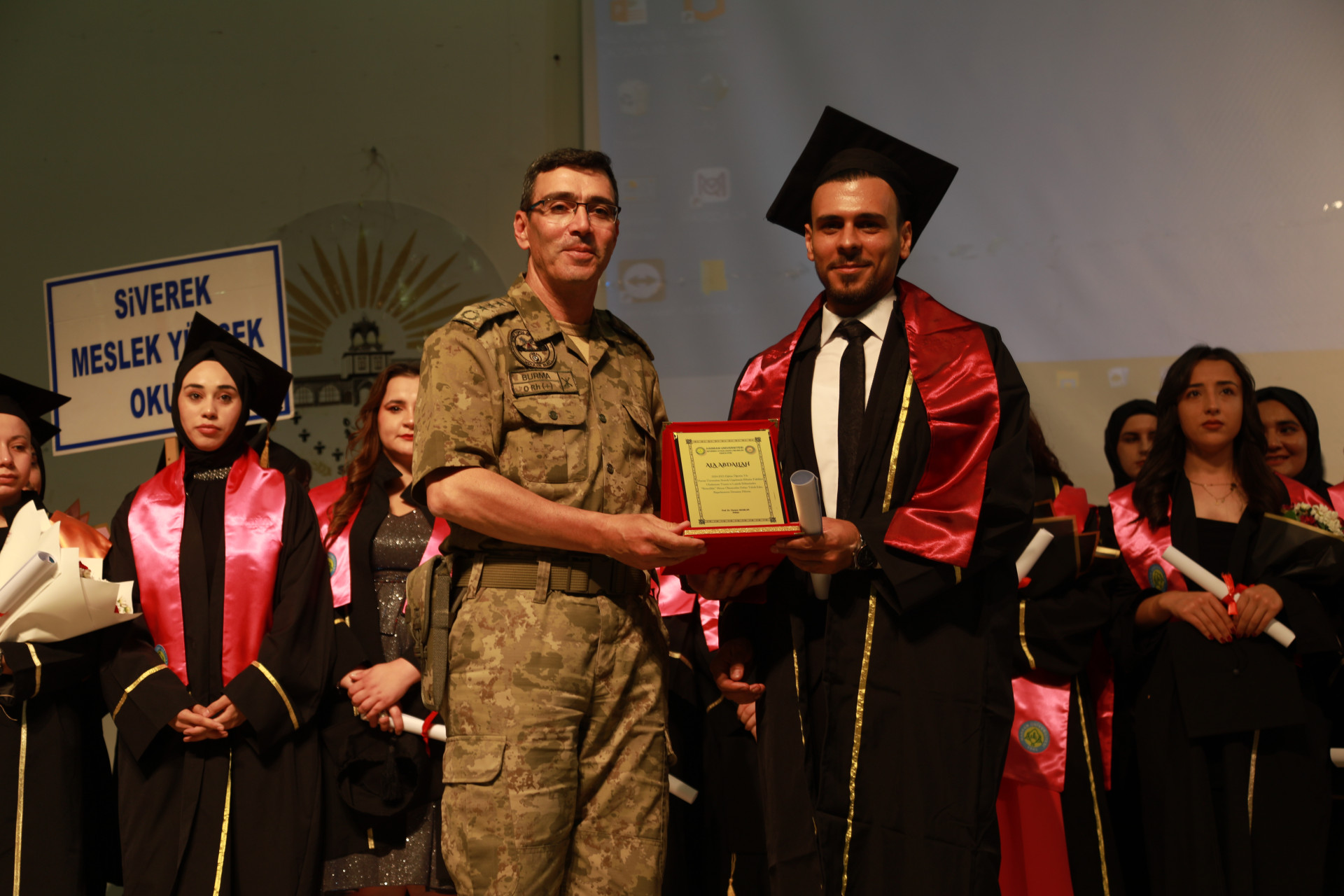Meslek Yüksekokulumuz ve Siverek Uygulamalı Bilimler Fakültesinin 2025 mezuniyet töreni 30 Mayıs 2025 Cuma günü saat 16.30 da Şanlıurfa Büyükşehir Belediyesi Siverek Kültür Merkezinde düzenlendi. Törene 107. Topçu Alay Komutanı Topçu Albay Hüseyin BURMA, Belediye Başkan Vekili Cumali BAYRAM, İlçe Emniyet Müdürümüz Tuncay YARDIM, Uygulamalı Bilimler Fakültesi Dekanı Prof.Dr.Dursun AKASLAN, Meslek Yüksekokulumuz Müdürü Doç.Dr. Mehmet Rağıp GÖRGÜN, Hilvan Meslek Yüksekokulu Müdürü Öğr.Gör.Serap ATEŞ, Daha önceki okulumuz Müdürlerinden Prof.Dr.İrfan ÖZBERK, Akçakale MYO Müdür Yardımcısı Doç.Dr. Fethiye ÖZBERK, Siverek Devlet Hastanesi Başhekimi Uzm.Dr. Ahmet YİĞİTBAY, Milli Eğitim Şube Müdürü Şaban BOZKURT, Halk Eğitim Merkezi Müdürü İbrahim BAYKAN, Ziraat Odası Başkanı Ahmet Ersin BUCAK, Ticaret ve Sanayi Odası Yönetim Kurulu Üyesi İzzet POLATOĞLU, Hidayet POLATOĞLU Terziler Odası Başkanı Hanefi AY, Madeni Eşyalar Odası Başkanı Haci İNAN,Eyüp Cenap Gülpınar Gençlik Merkezi Müdürü Mehmet TAŞLI, Memursen Temsilcisi Fikret ASLANPARÇASI, Tema Vakfı Siverek Temsilcisi Sertaç İLHAN, TÜGVA temsilcisi Ramazan LALE, Sivilder Onursal Başkanı Koçali AYMAZ, dernek Sivil toplum örgütleri temsilcileri, Okulumuz Öğretim Üyeleri, Öğretim Görevlileri, Basın Mensupları, Öğrenciler ve Aileleri katıldılar. Törende Okul Birincimiz Seher FIRAT ve Uygulamalı Bilimler Fakültesi Birincisi Ala ABDALLAH birer konuşma yaptılar. Okulumuz Müdürü Doç.Dr. Mehmet Rağıp GÖRGÜN, Uygulamalı Bilimler Fakültesi Prof.Dr. Dursun AKASLAN’ın konuşmasının ardından Belediye başkan Vekili Cumali BAYRAM mezun öğrencilere başarılar diledi. Mezuniyet törenin de bölümlerimizde dereceye giren öğrencilere plaketleri verildikten sonra kep atan öğrenciler müzik eşliğinde halay çekerek bu önemli günlerini kutladılar.