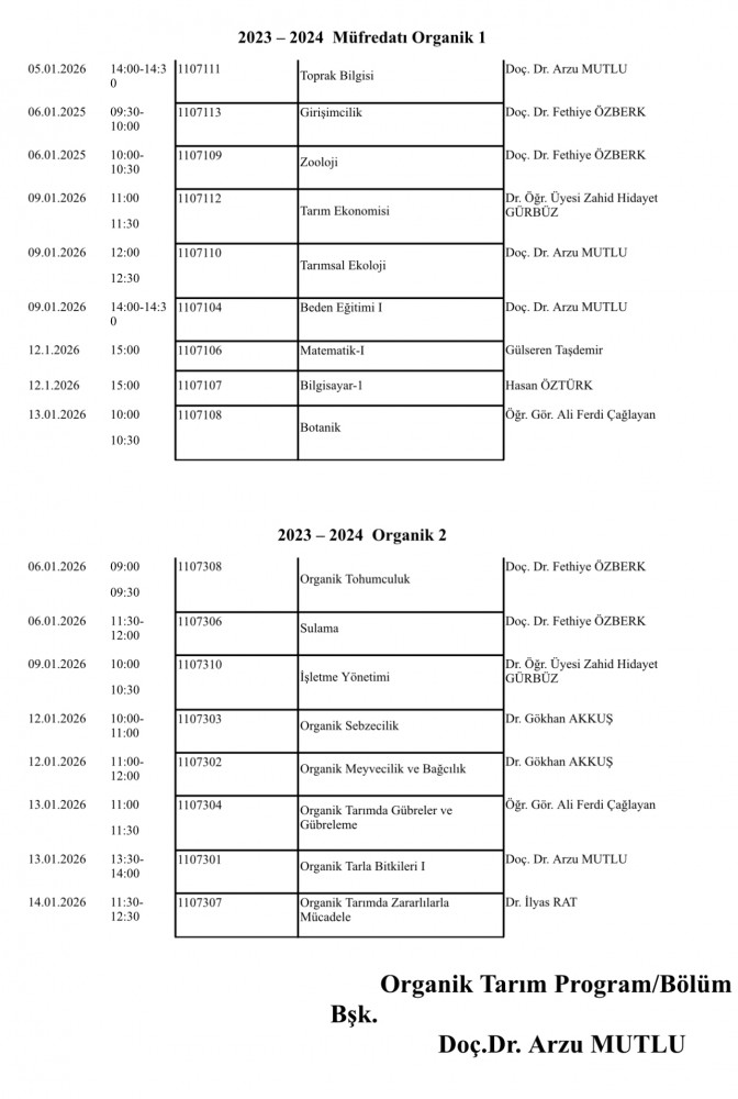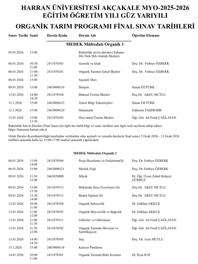 2025-2026 Güz Yarıyılı Final Sınav Programı