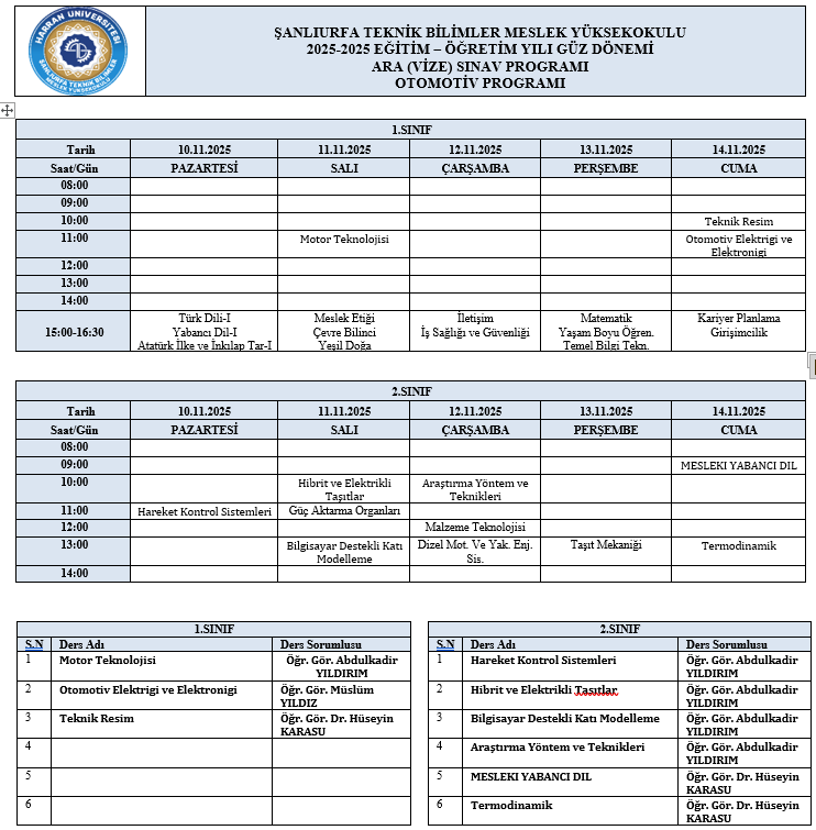 NOT: 2025-2026 Güz Dönemi Üniversitemiz Ortak Dersler Koordinatörlüğü tarafından yürütülen derslerin ara sınavları, Sınav Koordinatörlüğü tarafından belirlenen gün ve saatler doğrultusunda programlara işlnemiştir. Programa https://www.harran.edu.tr/idari/koordinatorlukler/sinav-koordinatorlugu uzantısından ulaşabilirsiniz.