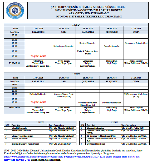 2025-2025 EĞİTİM – ÖĞRETİM YILI BAHAR DÖNEMİ ARA (VİZE) SINAV PROGRAMI