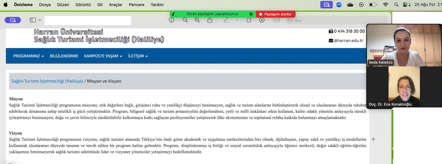 25 Ağustos 2025 tarihinde çevrimiçi olarak gerçekleştirilen dış paydaş toplantısında, Sağlık Turizmi İşletmeciliği Programı’nın misyon, vizyon ve politika belgeleri üzerine değerlendirmelerde bulunuldu.