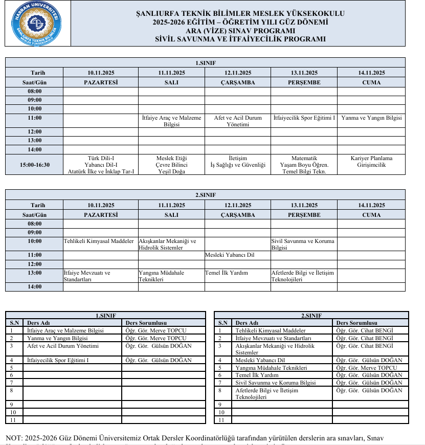 2025-2026 Güz Dönemi Ara Sınav (Vize) Programı