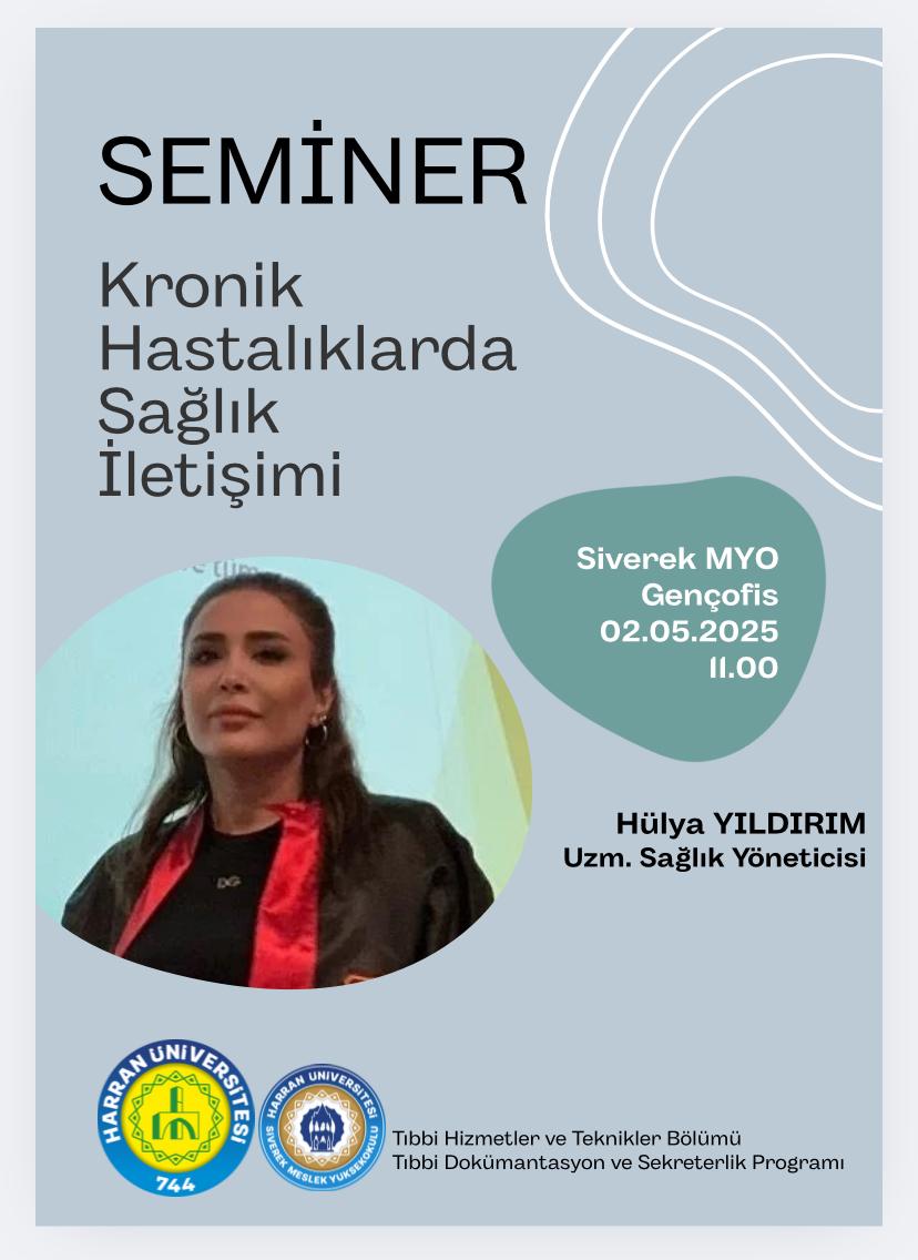 Meslek Yüksekokulumuz Tıbbi Dokümantasyon ve Sekreterlik Programı Öğrencilerine "Kronik Hastalıklarda Sağlık İletişimi" konulu seminer Uzman Sağlık Yöneticisi Hülya YILDIRIM tarafından verildi. Seminere öğrenciler ve Bölüm Başkanı Öğr.Gör. Dr.Hasan Celal BALIKÇI ve Program Başkanı Öğr.Gör. Ahmet YILDIZ da katıldılar.
