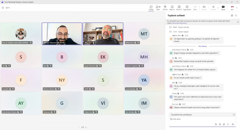 Yüksekokulumuz Seyahat, Turizm ve Eğlence Hizmetleri Bölümü Turist Rehberliği Programı tarafından düzenlenen “Turist Rehberliği Mesleği ve Kariyer” konulu söyleşi, 24 Şubat 2026 tarihinde çevrim içi ortamda, Öğr. Gör. Süleyman Can ASLAN moderatörlüğünde ve bölüm öğretim elemanlarının katılımıyla gerçekleştirildi.