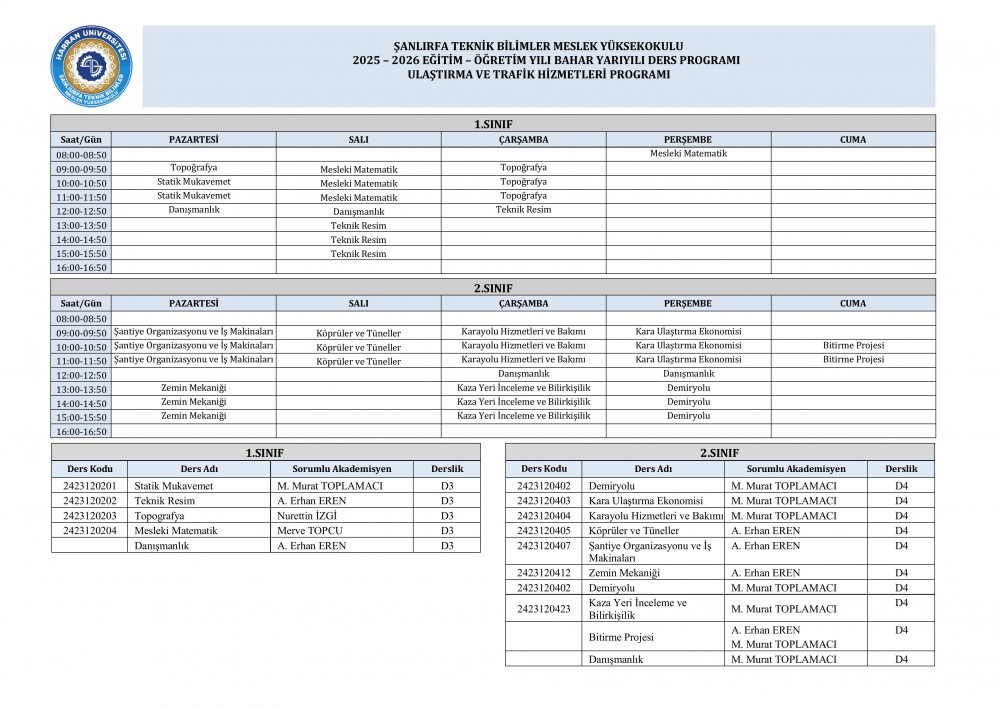 2025-2026 Eğitim Öğretim Yılı Bahar Dönemi Ders Programı