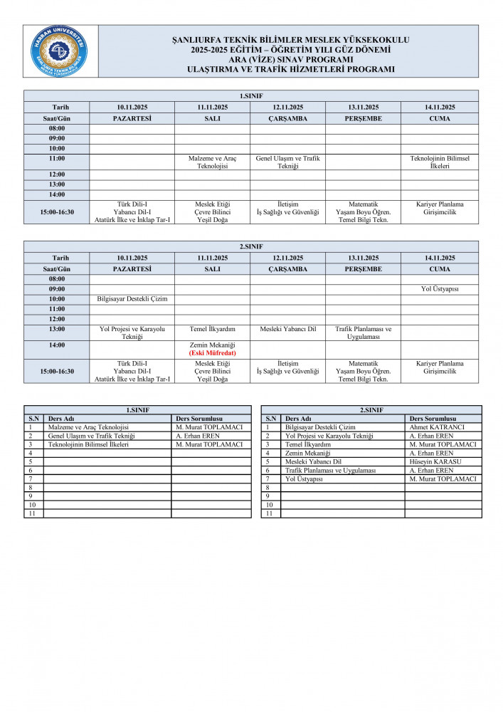 NOT: 2025-2026 Güz Dönemi Üniversitemiz Ortak Dersler Koordinatörlüğü tarafından yürütülen derslerin ara sınavları, Sınav Koordinatörlüğü tarafından belirlenen gün ve saatler doğrultusunda programlara işlenmiştir. Programa https://www.harran.edu.tr/idari/koordinatorlukler/sinav-koordinatorlugu uzantısından ulaşabilirsiniz.