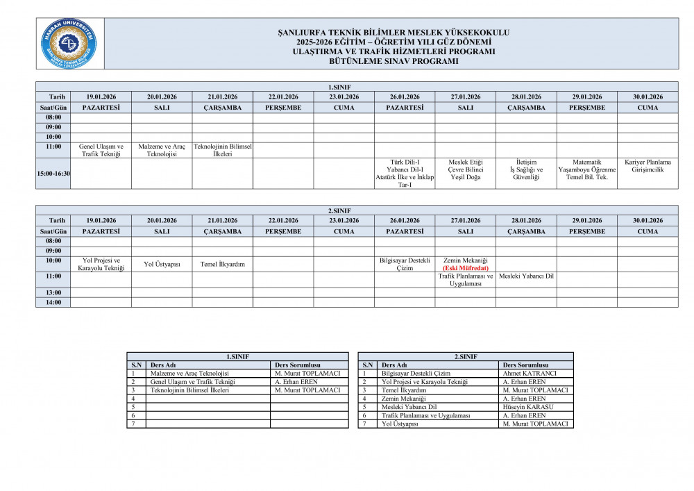 NOT: 2025-2026 Güz Dönemi Üniversitemiz Ortak Dersler Koordinatörlüğü tarafından yürütülen derslerin Bütünleme sınavları, Sınav Koordinatörlüğü tarafından belirlenen gün ve saatler doğrultusunda programlara işlenmiştir. Programa https://www.harran.edu.tr/idari/koordinatorlukler/sinav-koordinatorlugu uzantısından ulaşabilirsiniz.