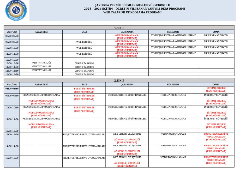 2025-2026 Bahar Dönemi Ders Programı