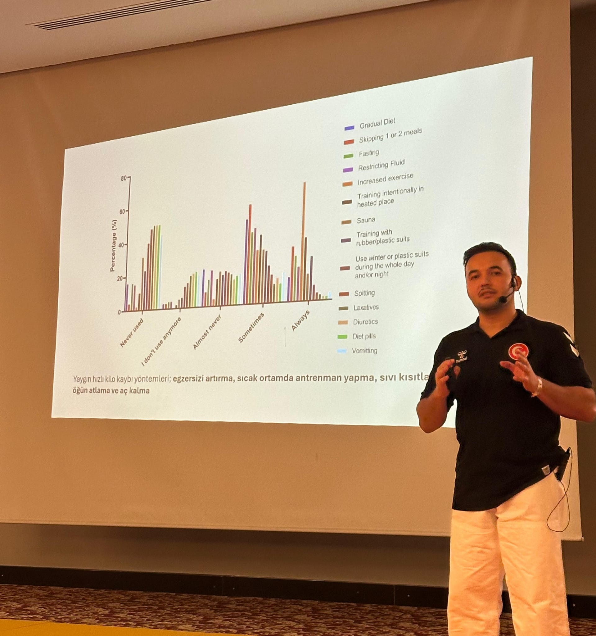 Araştırma Görevlisi Uğur Sarıkaya, 10–14 Ocak 2026 tarihleri arasında Antalya’da gerçekleştirilen seminer kapsamında, “Çocuk Judocularda Hidrasyon” başlıklı sunumunu gerçekleştirmiştir. Sunumda; hidrasyon, dehidrasyon ve rehidrasyon kavramlarına ilişkin temel bilgiler aktarılarak özellikle çocuk ve genç sporcularda müsabaka öncesi uygulanan hızlı kilo kaybı süreçlerinin oluşturabileceği riskler ele alınmıştır. Akut ve kronik dehidrasyonun çocuk sporcular üzerindeki sağlık, bilişsel süreçler ve sportif performans açısından olumsuz etkileri bilimsel veriler ışığında değerlendirilmiştir. Ayrıca çocuk judocularda optimal hidrasyonun sağlanması için sporcu, antrenör ve ebeveynlerin rolü vurgulanmış; su tüketim zamanlaması, yeterli sıvı alımının takibi ve antrenman ortamında uygulanabilecek basit ancak etkili önleyici stratejiler katılımcılarla paylaşılmıştır.