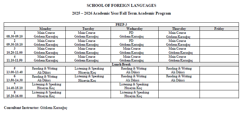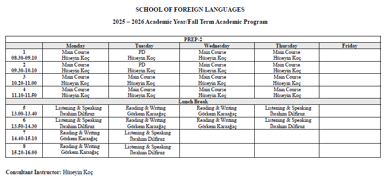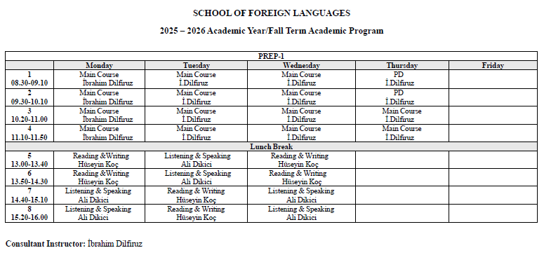Yüksekokulumuz, 2025 - 2026 Eğitim Öğretim Yılı Güz Dönemi ders programı bilgileri kesinleşmiştir. Bu bağlamda, Yüksekokulumuz Hazırlık Programlarında eğitimlerini sürdürecek Zorunlu İngilizce Hazırlık Programı öğrencileri için 1 sınıf (Prep 1); İsteğe Bağlı Hazırlık Programı öğrencileri içinse 2 sınıf (Prep 2 ve Prep 3) oluşturulmuştur.