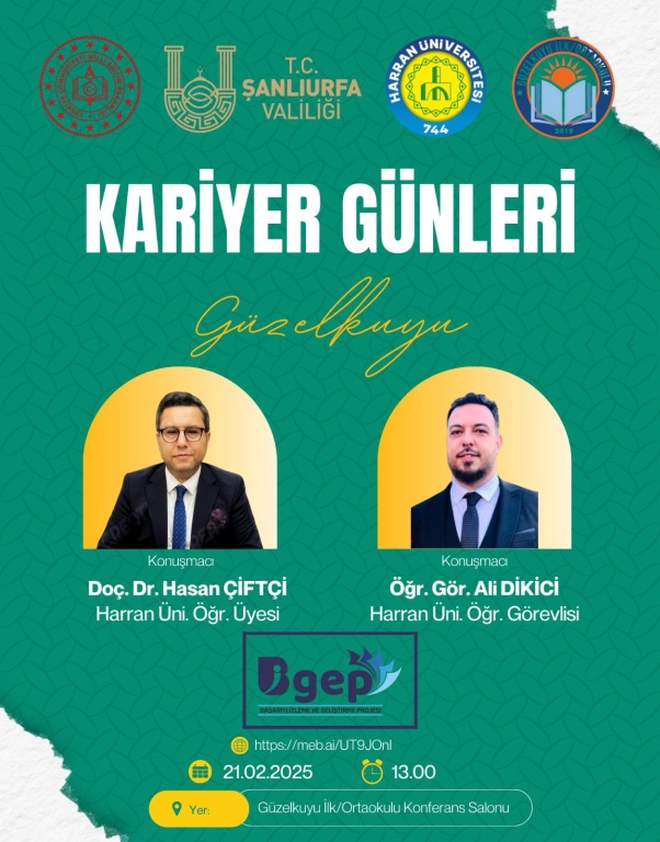 Şanlıurfa Güzelkuyu İlk/Ortaokulu, BİGEP kapsamında öğrencilerin meslek seçimi ve kariyer planlaması konularında bilinçlenmelerini sağlamak amacıyla düzenlediği Kariyer Günleri etkinliğine Üniversitemizden iki akademik personeli davet etti. Etkinliğe, Harran Üniversitesi Öğretim Elemanlarından Doç. Dr. Hasan ÇİFTÇİ ile Yüksekokulumuz Müdür Yardımcısı Öğr. Gör. Ali DİKİCİ katıldı. Konuklar; akademik personel olmanın incelikleri, meslek tanıtımı ve kariyer planlamanın önemi üzerine tecrübelerini ve önerilerini öğrencilerle paylaştı. Gerçek yaşam deneyimleri, öğrencilerin geleceğe yönelik bilinçli adımlar atmalarında önemli bir rehber niteliği taşıdı.
