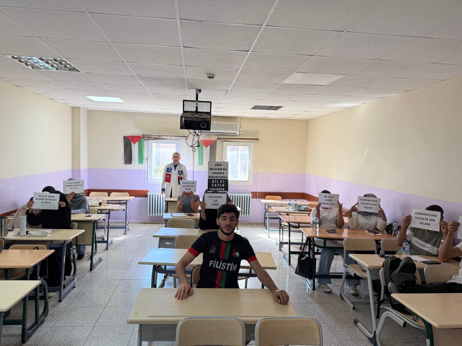 2025-2026 Eğitim-Öğretim Yılı’nın ilk dersi, Yükseköğretim Kurulu’nun (YÖK) yazısı doğrultusunda, Gazze’de yaşanan insani drama dikkat çekmek amacıyla anlamlı bir içerikle gerçekleştirildi.