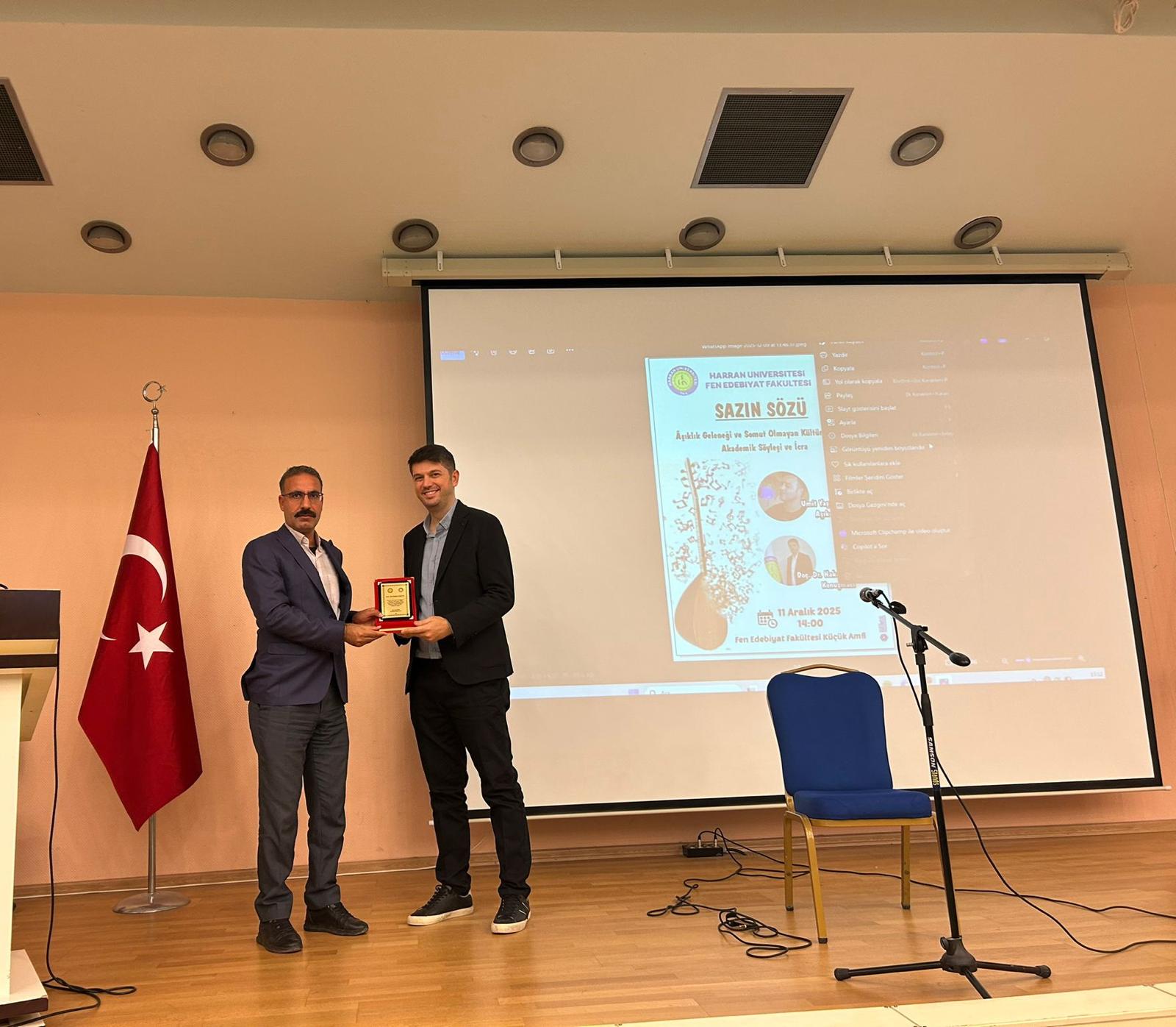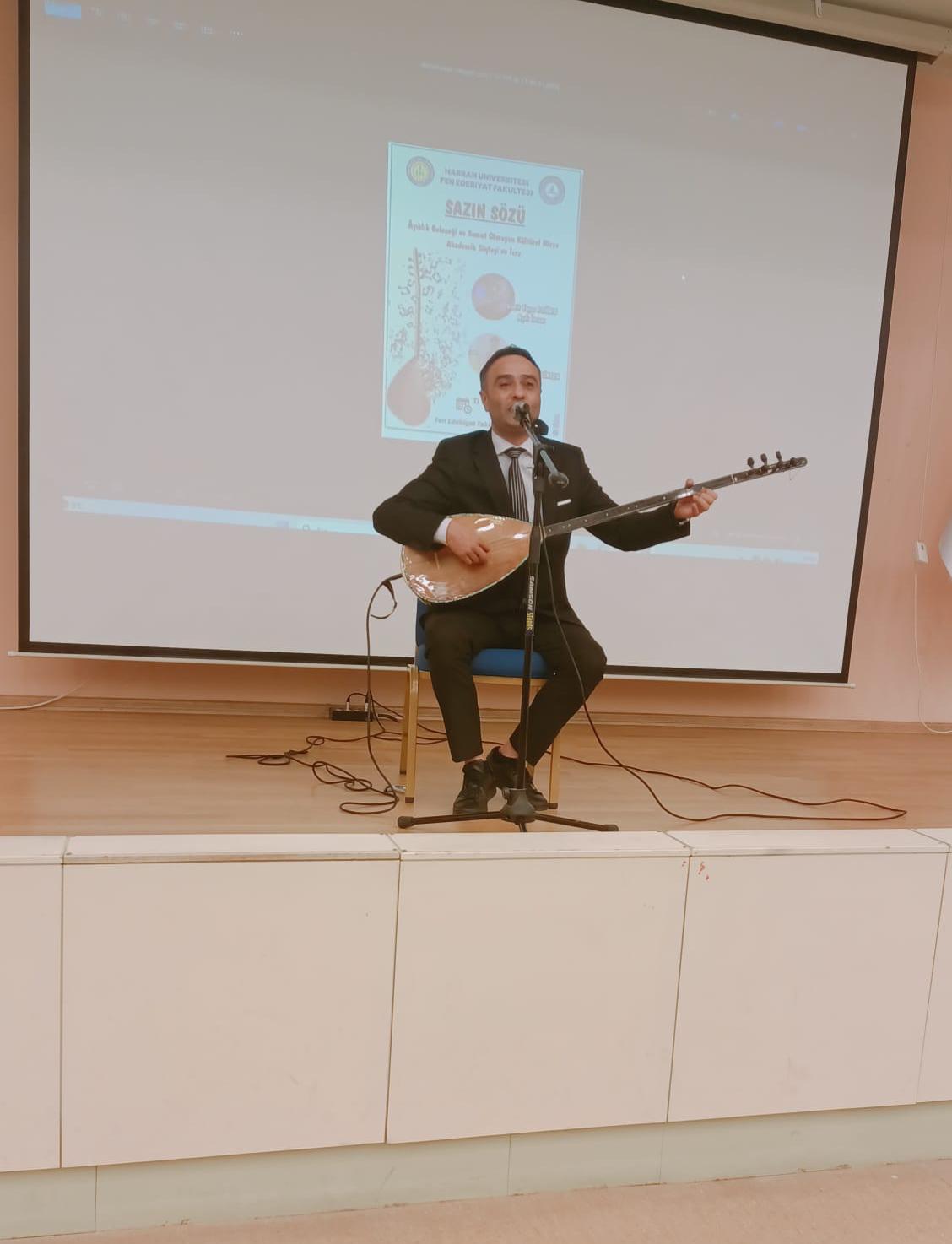 Fakültemiz bünyesinde, Türk Dili ve Edebiyatı Bölümü öğretim üyesi Doç. Dr. Hakan Çelikten’in akademik sunumu ile Şanlıurfa Türk Halk Müziği Devlet Korosu Müdürü Âşık Ümit Yaşar’ın âşık tarzı şiir geleneğini yansıtan örnekleri icra ettiği “Sazın Sözü: Âşıklık Geleneği ve Somut Olmayan Kültürel Miras / Akademik Söyleşi ve İcra” adlı etkinlik, 11.12.2025 tarihinde saat 14.00’te Fakültemizin küçük amfisinde gerçekleştirilmiştir. Akademisyenleri, gelenek temsilcisini ve öğrencileri bir araya getiren bu etkinlikte, UNESCO kapsamında âşıklık geleneği özelinde geleneğin üretim ve tüketim bağlamları değerlendirilmiş; teoriden icraya uzanan bir yaklaşımla kültürel farkındalık oluşturmayı amaçlayan bir faaliyet yürütülmüştür.