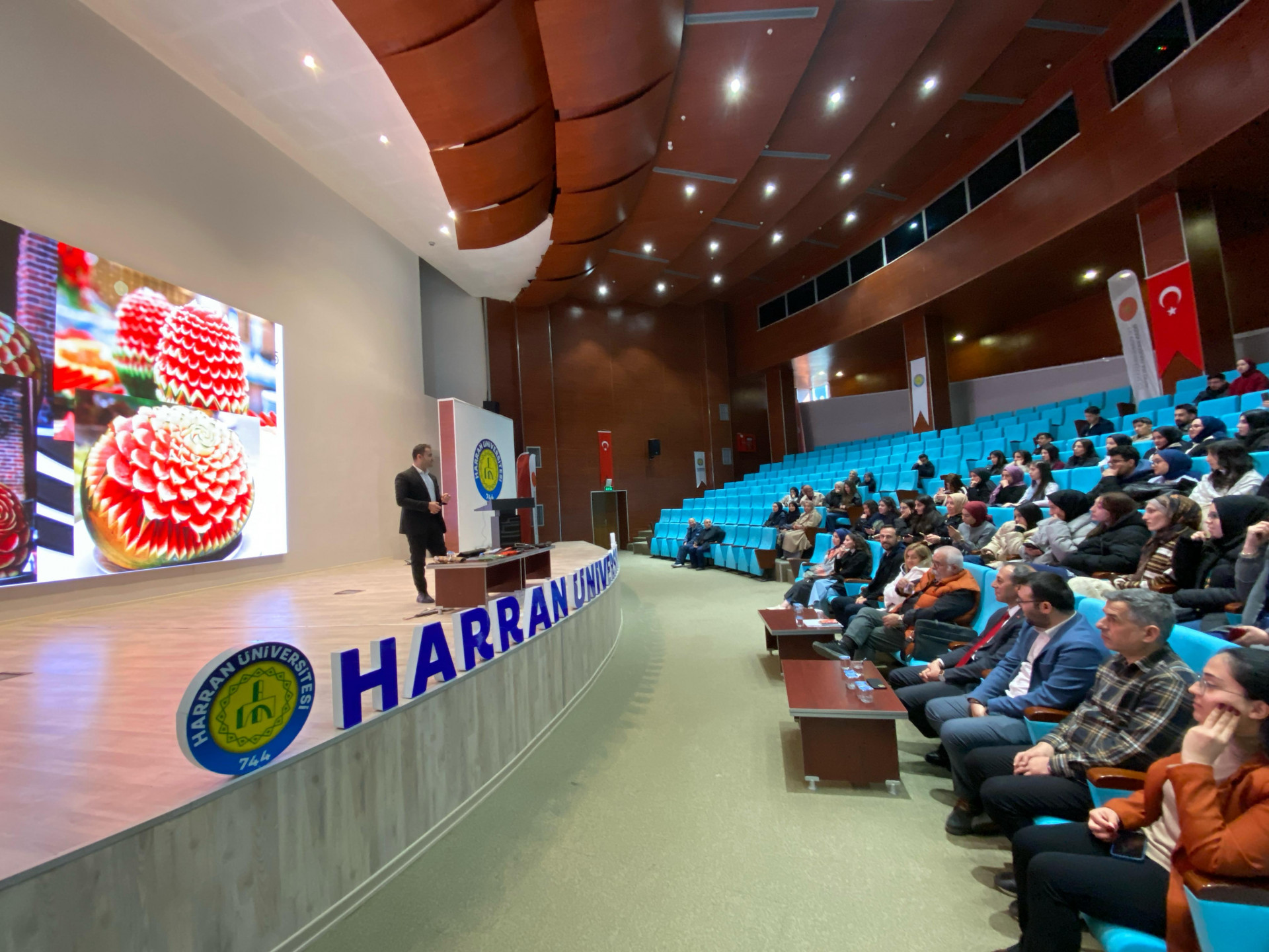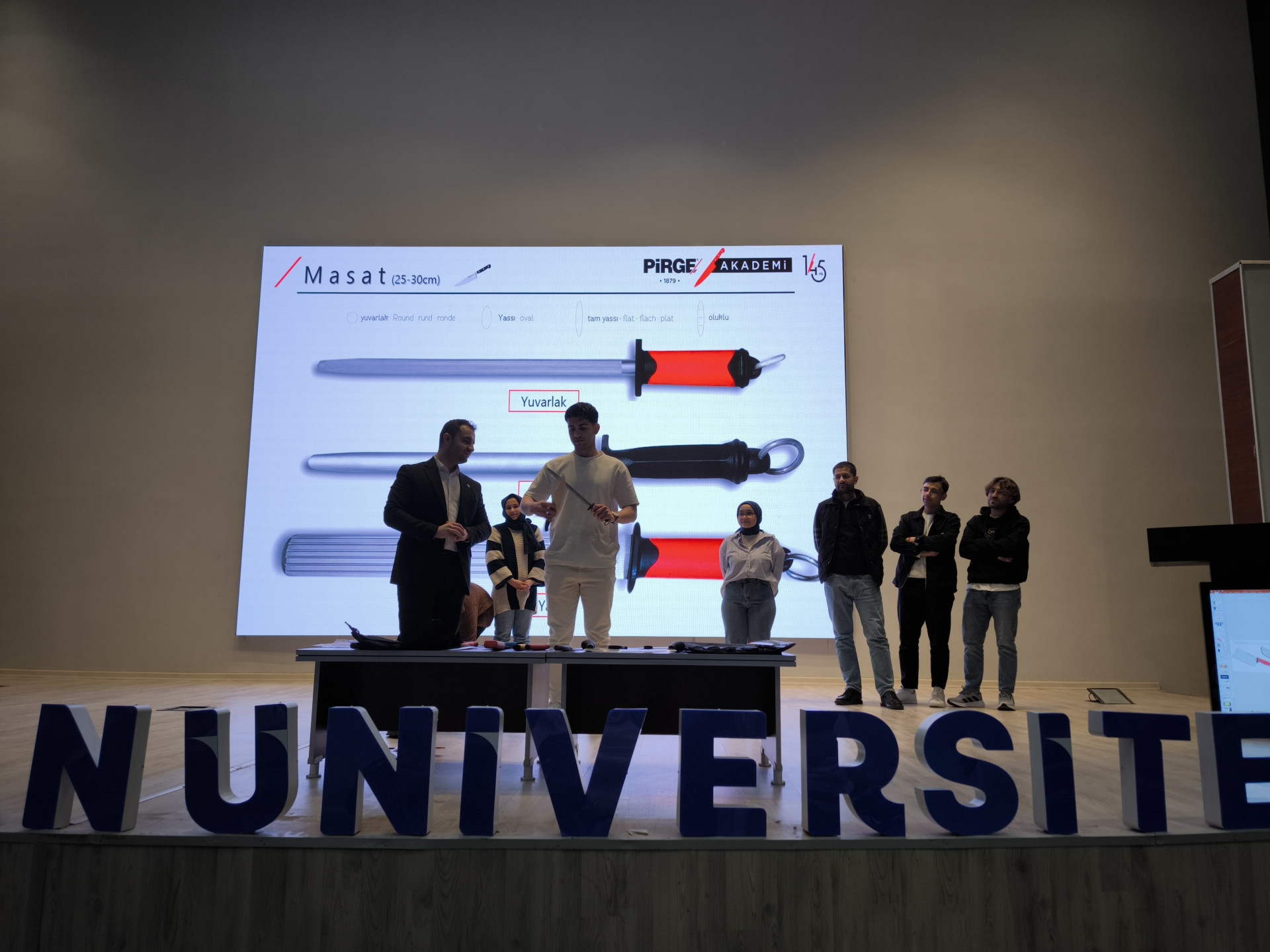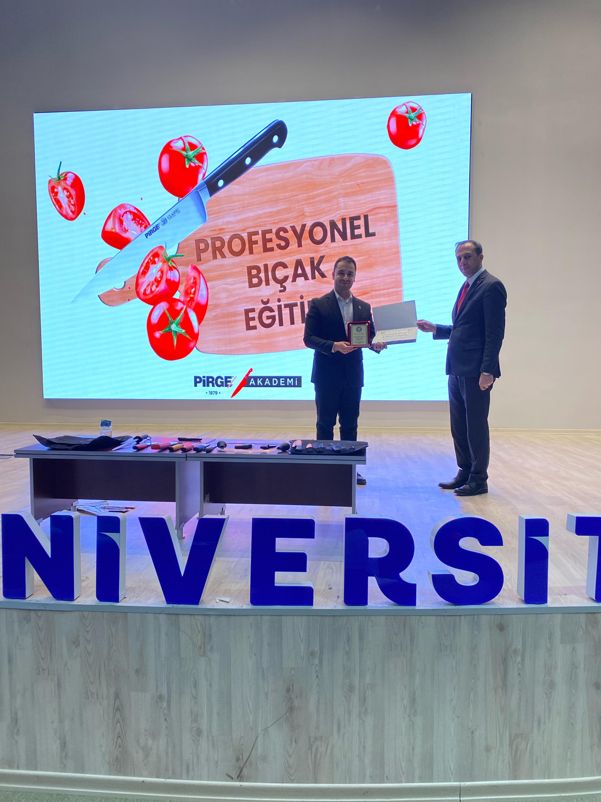 Fakültemiz Gastronomi ve Mutfak Sanatları öğrencileri, profesyonel bıçak kullanımı konusunda Pirge Kurumsal Eğitim Uzmanı Fırat ERBİL'den kapsamlı bir eğitim aldı. Konferans Salonu’nda düzenlenen eğitimde, farklı bıçak türleri, kullanım amaçları ve doğru teknikler hakkında bilgiler verildi.