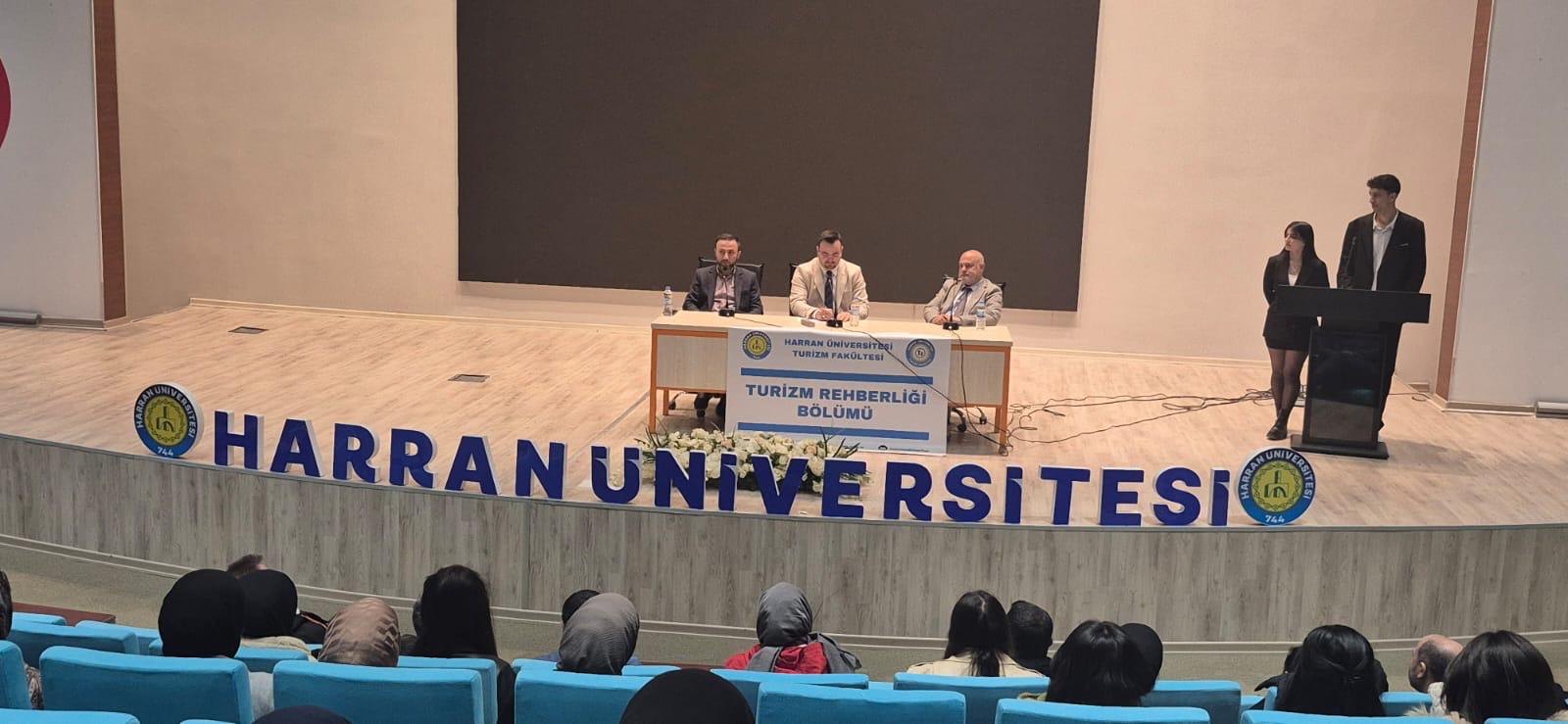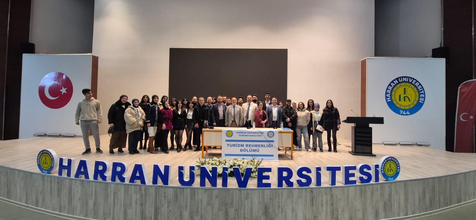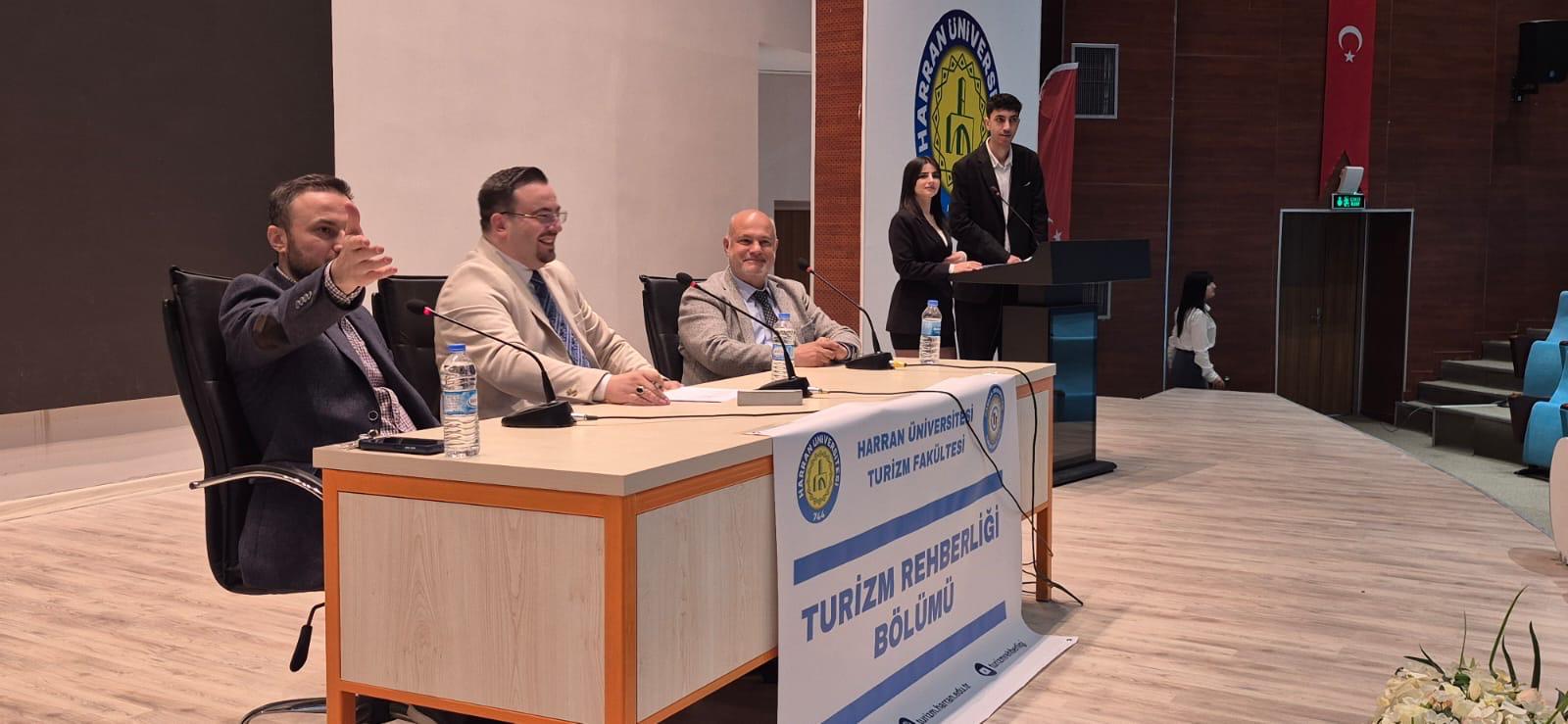 Fakültemiz Turizm Rehberliği Bölümü’nde “Dünya Turist Rehberleri Günü” kapsamında “Bir Yol Bin Hikâye: Rehberlikte Tecrübeler ve İlhamlar” adlı söyleşi etkinliği gerçekleştirildi. Moderatörlüğünü Turizm Rehberliği Bölüm Başkanı Doç. Dr. Seyit Ahmet Solmaz’ın yaptığı söyleşide ŞURO Yönetim Kurulu Başkanı Müslüm AKKAY ile Akademisyen-Turist Rehberi ve fakültemiz öğretim üyesi Dr. Abdullah ÜLKÜ konuşmacı olarak yer aldı. Törenin açılış konuşmasını yapan fakültemiz dekan yardımcısı Dr. Öğr. Üyesi Levent Selman GÖKTAŞ, turist rehberlerinin turizm sektörünün en önemli aktörleri olarak yalnızca mekanları tanıtan kişiler olmadığını, kültürleri buluşturan, tarihi ve doğal mirası geleceğe aktaran profesyoneller olduğunu dile getirdi. Turist rehberinin anlatımıyla bir taşı bazen bir anıta, bir sokağı ise hikâyeye dönüştürebildiğini aktardı.
