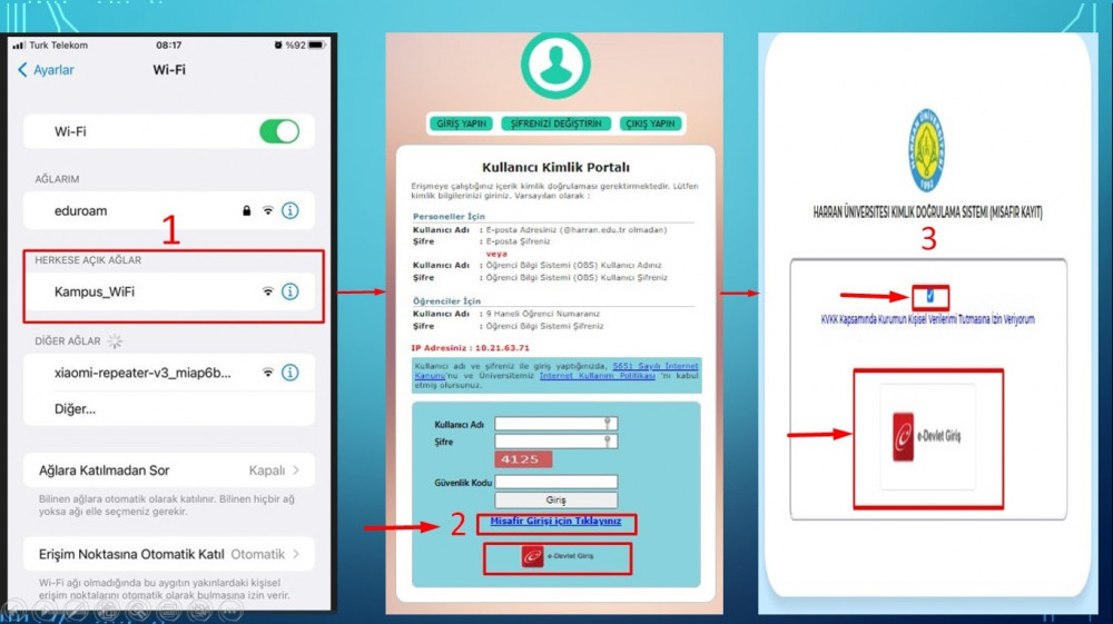 Kampüslerimize herhangi bir nedenle ziyarete gelen misafirlerimiz internet hizmetlerinden ücretsiz bir şekilde faydalabilmektedir.Bunun için;