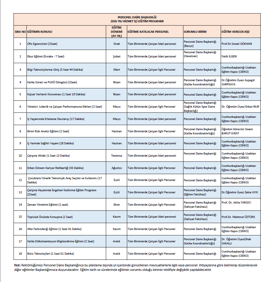 2026 YILI HİZMET İÇİ EĞİTİM PROGRAMI
