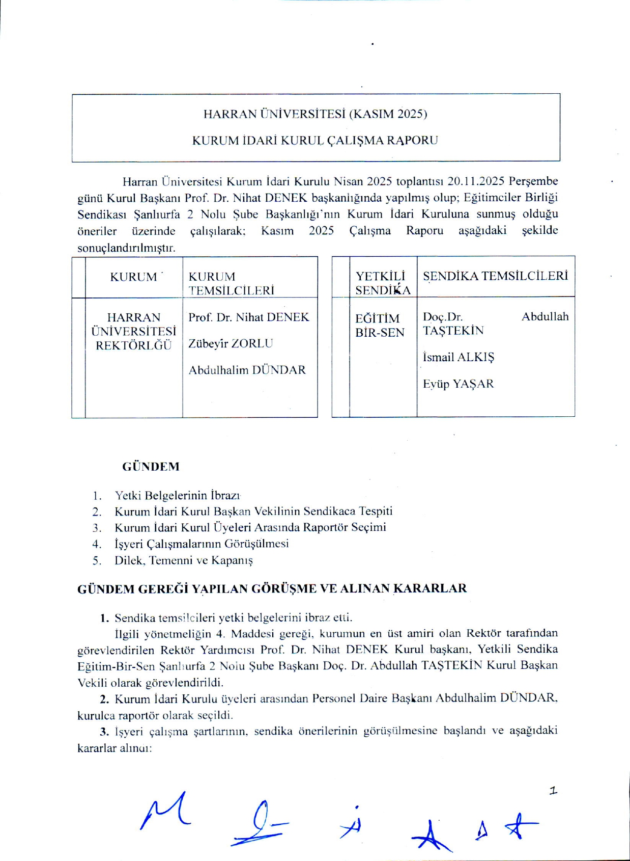 Toplu Sözleşme Görüşmelerinin Yapılma Usul ve Esasları ile Kamu Görevlileri Hakem Kurulu, Kamu Personeli Danışma Kurulu ve Kurum İdari Kurullarının Teşkili, Çalışma Usul ve Esaslarına İlişkin Yönetmelik gereği Üniversitemiz Kurum İdari Kurulu toplantısı Eğitimciler Birliği Sendikası Şanlıurfa 2 Nolu Şube Başkanlığı ile Rektörlüğümüz arasında 20.11.2025 tarihinde yapılarak Kasım 2025 Çalışma Raporu aşağıdaki şekilde sonuçlandırılmıştır.