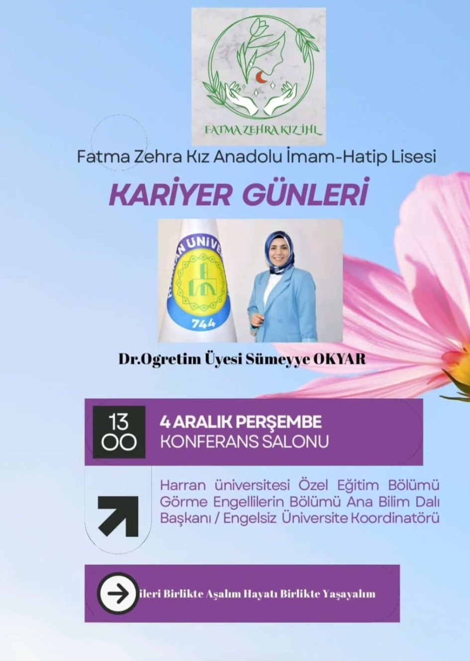 Harran Üniversitesi Engelsiz Üniversite Koordinatörlüğü tarafından, 3 Aralık Dünya Engelliler Günü ve Kariyer Günleri etkinlikleri kapsamında, ilde bulunan Fatma Zehra Kız Anadolu İmam Hatip Lisesi öğrencileri ve öğretmenlerine yönelik kapsamlı bir seminer gerçekleştirilmiştir.