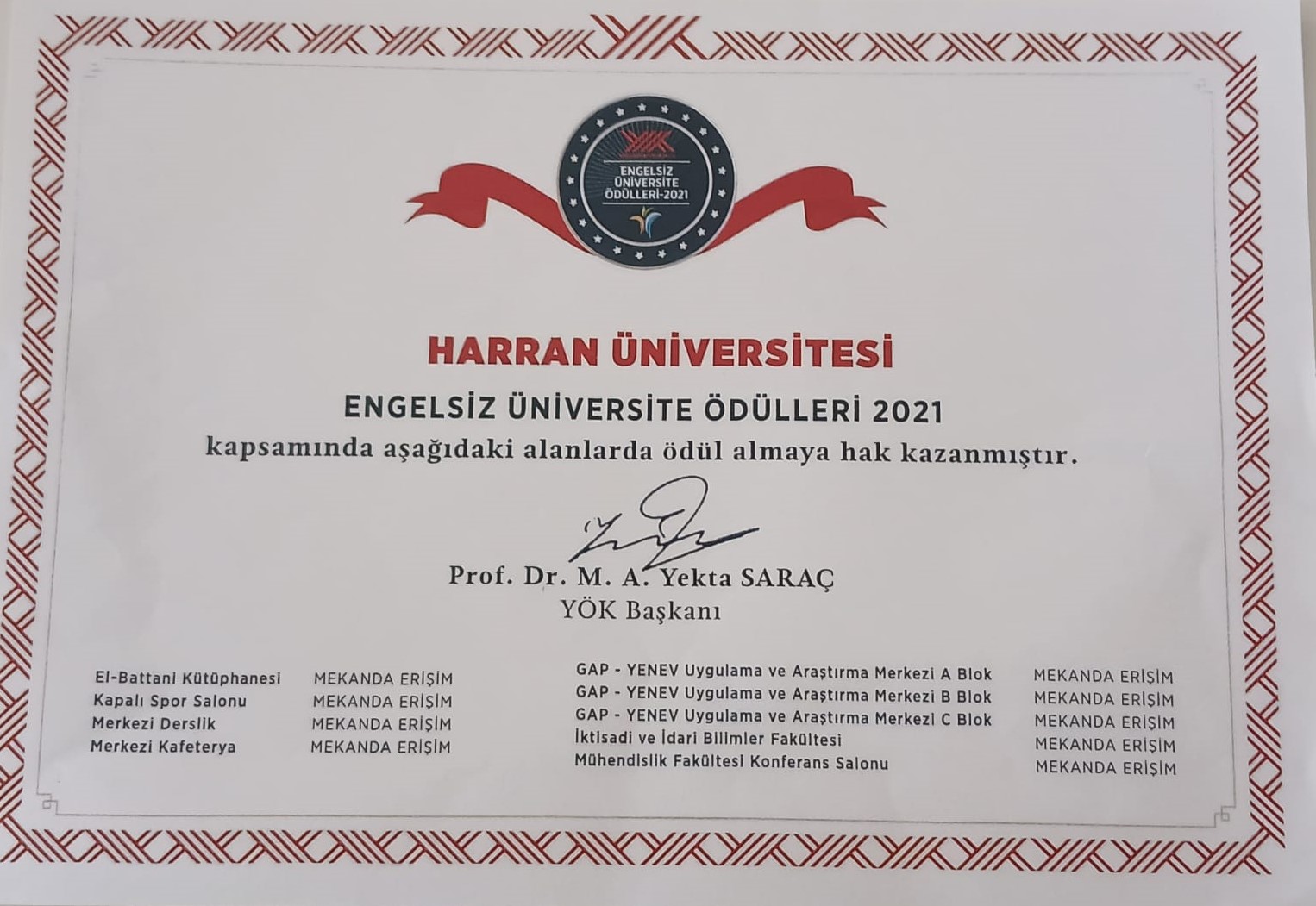 Harran Üniversitesi'nin 1 adet Sosyo-Kültürel Faaliyetlerde Erişilebilirlik (Mavi Bayrak) ve 1 adet YÖK Erişilebilirlik Ödülü bulunmaktadır.