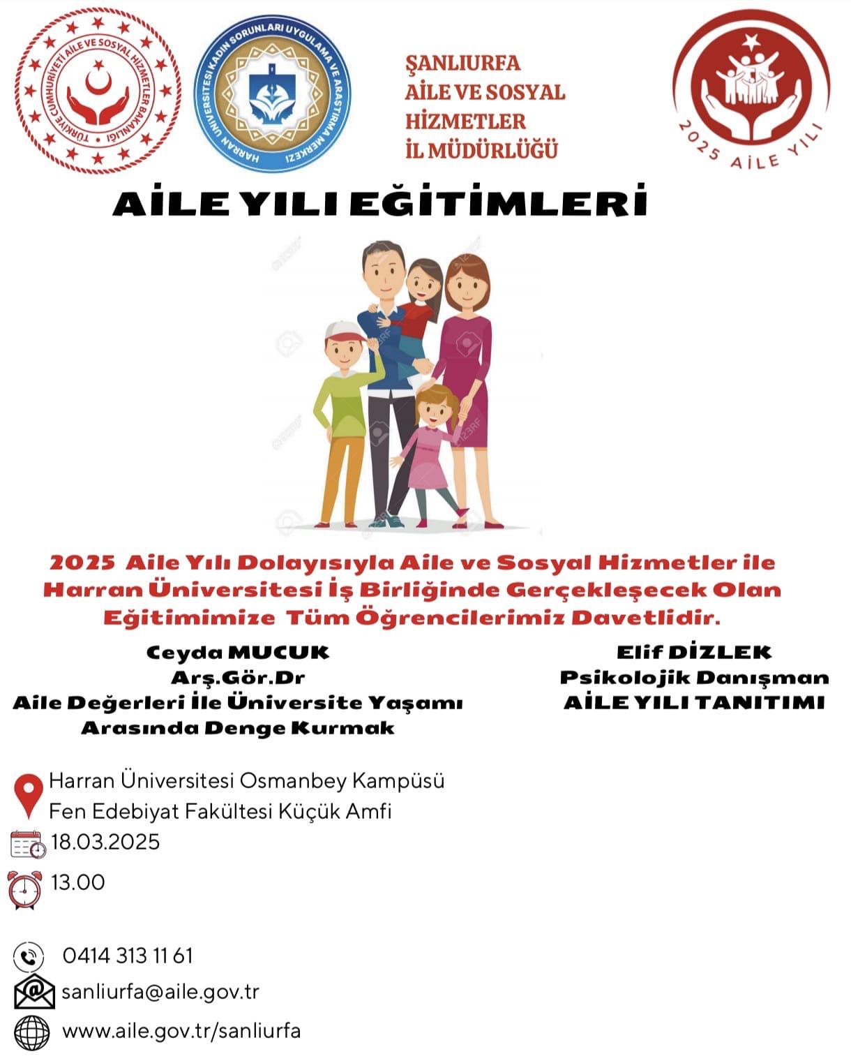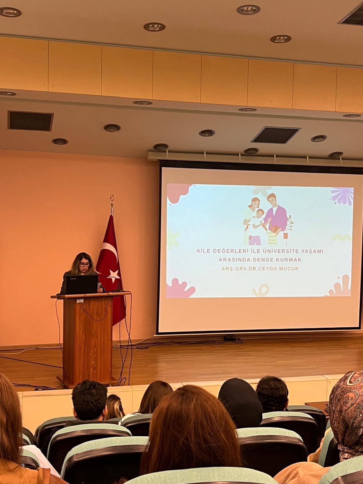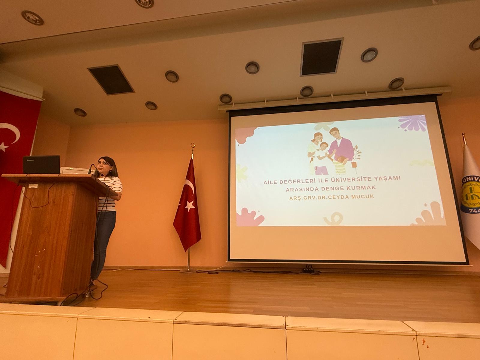 HARÜKAM ve Aile Sosyal Hizmetler İl Müdürlüğü işbirliği ile düzenlediğimiz Aile Yılı Eğitimleri kapsamında Psikiyatria Anabilim Dalı Arş. Gör. Dr. Ceyda MUCUK ''Aile Değerleri ile Üniversite Yaşamı Arasında Denge Kurmak'' konusunda seminer verirken Aile ve Sosyal Hizmetler İl Müdürlüğünde görevli Psikolojik Danışman Elif Dizlek ''Aile Yılı Tanıtımı'' konulu sunumu gerçekleştirdi. Fen Edebiyat Fakültesi'nde gerçekleştirilen etkinliğe çok sayıda öğrenci ve akademisyen katıldı.