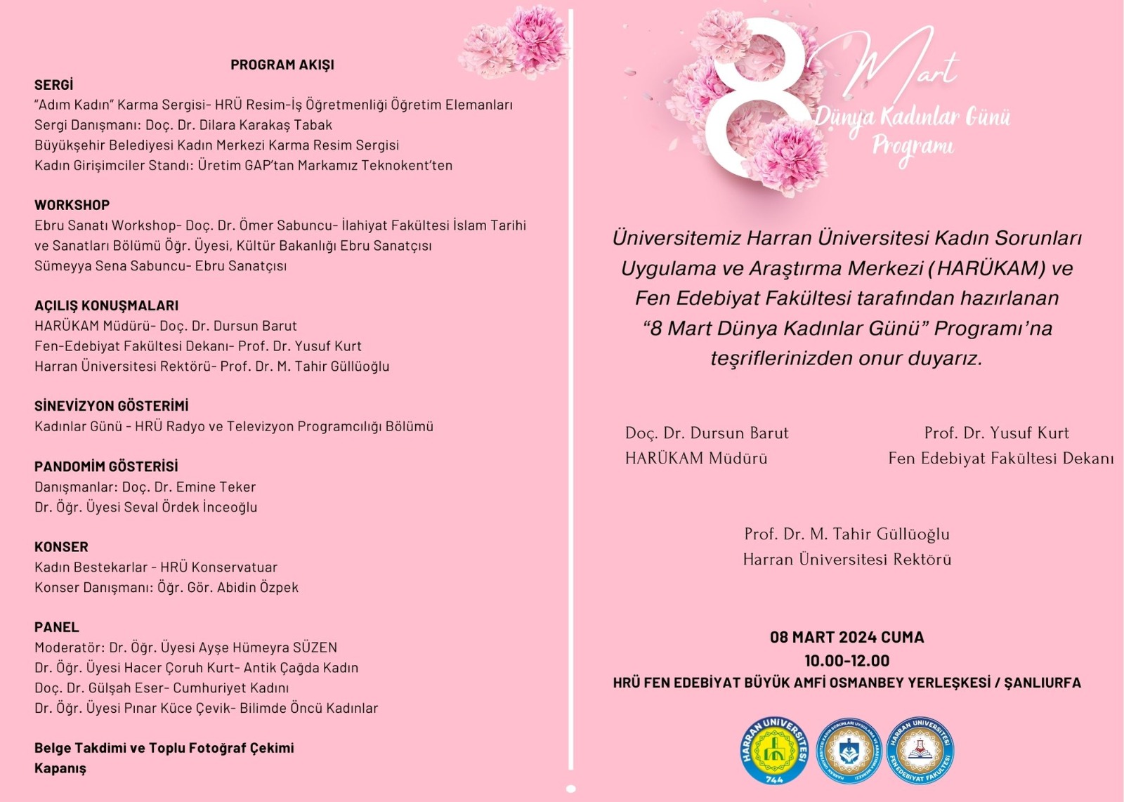 Radyo ve Televizyon Programcılığı Bölümümüz tarafından Kadınlar Gününe özel sinevizyon gösterimi, Eğitim Fakültesi Dekan Yardımcımız Doç. Dr. Emine Teker ile Dr. Öğr. Üyesi Seval Ördek İnceoğlu’un danışmanlığında pandomim gösterimi ve Öğr. Görevlisi Abidin Özpek danışmanlığında Harran Üniversitesi Konservatuarı bölümü tarafından Kadın Bestekârlar konseri icra edildi.